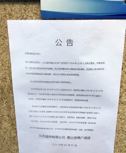 近日,網(wǎng)上流傳一條“樂天瑪特超市唐山世博廣場店即將閉店”的消息。 10月31日,本網(wǎng)記者前往該店了解情況,在入口處看到貼出的“撤店公告”,證實該消息屬實。樂天瑪特也成為繼樂購、家樂福之后,在唐山閉店的又一家大型外資連鎖超市。 記者在超市內(nèi)看到,目前工作人員正在清倉,部分貨架已經(jīng)清空,只有冷凍食品區(qū)仍有一些顧客正在搶購促銷商品。超市內(nèi)部其它商鋪大部分也已經(jīng)撤離,還有一些商鋪正在進行清倉甩賣。 據(jù)超市負責(zé)人介紹,由于合同到期,樂天瑪特超市世博廣場店將于2016年12月1日起停止營業(yè)。11月1日起,超市的部分剩余貨品將半價賣。此外,樂天瑪特會員卡自2016年11月1日起停止積分。11月15日前,會員可持會員卡和本人身份證進行積分抵現(xiàn),450積分可抵3元。購物卡則需在11月15日前消費或辦理退卡,消費者也可以選擇到北京、天津、涿州、燕郊等樂天瑪特各門店使用。 樂天瑪特(LOTTE MART)是韓國樂天集團下屬的專營大型超市的子公司,唐山樂天瑪特超市世博廣場店于2013年5月23日開業(yè),至今已營業(yè)近三年半。 (來源:環(huán)渤海新聞網(wǎng) 記者:鄭雪靚) |