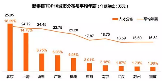根據(jù)獵聘大數(shù)據(jù)顯示,新零售仍處在發(fā)展路徑探索期,國(guó)內(nèi)重點(diǎn)城市已經(jīng)展開(kāi)對(duì)人才的新一輪搶位。 北京低調(diào)地做成了新零售創(chuàng)業(yè)氛圍最濃厚的城市,對(duì)新零售人才需求以24.33%的比例占全國(guó)第一。上海以新零售促進(jìn)消費(fèi),對(duì)新零售人才需求僅次于北京。 作為新零售概念發(fā)源地的杭州對(duì)新零售人才需求僅次于深圳、廣州。成都作為西南地區(qū)重要城市,也是新零售企業(yè)必爭(zhēng)之地,新零售人才需求全國(guó)第六。 |