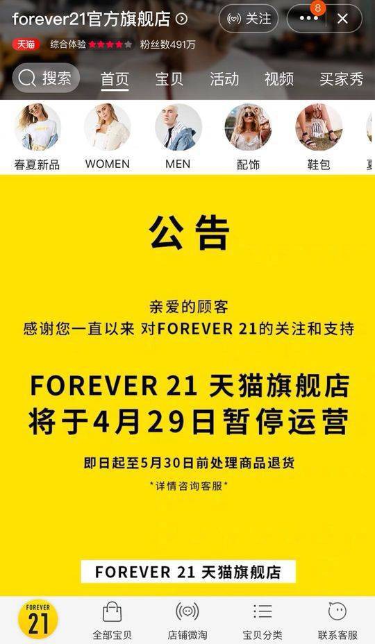 4月25日消息,美國快時尚品牌Forever21天貓與京東旗艦店分別發(fā)布公告,稱將于4月29日起暫停運營,此舉疑似Forever21退出國內(nèi)市場。 自去年年底,F(xiàn)orever21已陸續(xù)關掉了天津、杭州、北京、重慶等地門店,而其于近日宣布了關閉在西安唯一一家門店的消息。目前,該品牌在上海僅剩的有晶品、長寧來福士、南京東路3家分店以及北京的悠唐店。 國外市場方面,該品牌自去年11月初已經(jīng)關閉了3家法國門店,有消息稱,其計劃在今年全面退出法國市場。目前Forever21在法國僅剩下位于巴黎的旗艦店。 (來源/財經(jīng)網(wǎng)) |