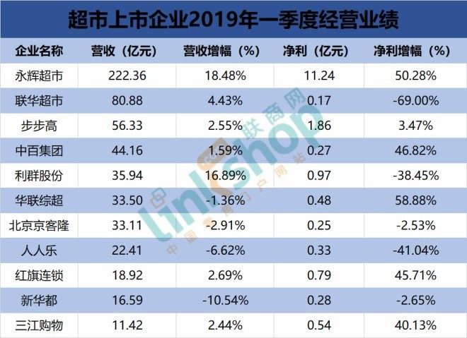 超市上市企業(yè)交出了2019年首份成績單。 據(jù)《聯(lián)商網(wǎng)》大數(shù)據(jù)研究中心統(tǒng)計(jì),已公布一季報(bào)的11家超市上市企業(yè)2019年第一季度實(shí)現(xiàn)營收總額575.62億元,較去年同期增長7.92%;凈利潤總額17.17億元,較去年同期增長24.51%。 ▲超市上市企業(yè)2019年一季度經(jīng)營業(yè)績情況,數(shù)據(jù)來源:公司財(cái)報(bào),聯(lián)商網(wǎng) 從單個(gè)企業(yè)來看,營收凈利雙增的有5家,分別為永輝超市、步步高、中百集團(tuán)、紅旗連鎖、三江購物;營收增凈利降的有2家,分別為聯(lián)華超市、利群股份;營收降凈利增的有1家,為華聯(lián)綜超;營收凈利雙降的有3家,分別為北京京客隆、人人樂、新華都。 ▲超市上市企業(yè)2019年一季度業(yè)績變動(dòng)分布情況,數(shù)據(jù)來源:聯(lián)商網(wǎng) 門店拓展方面,永輝超市一季度新開大店21家,此外還開出Mini店93家;聯(lián)華超市新開52家,但同時(shí)也關(guān)閉了37家。永輝超市和聯(lián)華超市也是擴(kuò)張速度最靠前的兩家企業(yè)。此外,新華都單季度集中處置了19家虧損門店。 ▲超市上市企業(yè)2019年一季度開關(guān)店情況,其中“/”代表該項(xiàng)數(shù)據(jù)未在報(bào)告中體現(xiàn)。數(shù)據(jù)來源:公司財(cái)報(bào),聯(lián)商網(wǎng) 永輝超市:營收增長18.48%,凈利增長50.28% 剛剛經(jīng)歷了2018年陣痛的永輝,在2019年開年首季迎來強(qiáng)勢(shì)反彈,公司一季度實(shí)現(xiàn)營收222.36億元,較去年同期增長18.48%;歸屬于上市公司股東的凈利潤11.24億元,較去年同期增長50.28%。這也是永輝自2012年以來,連續(xù)7年一季度凈利潤實(shí)現(xiàn)正增長。 門店拓展方面,一季度新開綠標(biāo)店21家、Mini店93家。截止2019年一季度末,永輝門店總數(shù)達(dá)到729家。門店儲(chǔ)備方面,一季度新簽約綠標(biāo)店27家,Mini店146家。 按照規(guī)劃,永輝2019年計(jì)劃新開門店150家,并進(jìn)行新業(yè)態(tài)“Mini店”的探索,同時(shí)組建大科技部,重構(gòu)到店體系、新建到家體系。 聯(lián)華超市:營收增長4.43%,凈利下滑69% 剛剛減虧的聯(lián)華超市,2019年首季度凈利潤又明顯下滑,一季度實(shí)現(xiàn)營收80.88億元,同比增長4.43%;歸屬于公司所有者的凈利潤1710.48萬元,同比減少69%。 門店拓展方面,一季度新開門店52家,同時(shí)關(guān)閉門店37家,其中大型綜合超市新開1家,無門店關(guān)閉;超級(jí)市場(chǎng)新開45家,關(guān)閉20家;便利店新開6家,關(guān)閉17家。截至一季度末,聯(lián)華超市共擁有門店3386家,其中大型綜合超市143家,超級(jí)市場(chǎng)1932家,便利店1311家。 2019年,聯(lián)華超市計(jì)劃新開門店308家,其中,新開大型綜合超市業(yè)態(tài)門店8家,超級(jí)市場(chǎng)200家,便利店100家。同時(shí)推進(jìn)社區(qū)生鮮、社區(qū)便捷和精選超市三種店型的進(jìn)一步定型及迭代,并將創(chuàng)新孵化「精品零售 +餐飲多元體驗(yàn)」新業(yè)態(tài)作為重點(diǎn)項(xiàng)目。 步步高:營收增長2.55%,凈利增長3.47% 回歸商超主業(yè)的步步高,一季度延續(xù)了去年的增長勢(shì)頭,公司一季度實(shí)現(xiàn)營業(yè)收入56.19億元,同比增長2.55%;歸屬于上市公司股東的凈利潤1.86億元,同比增長3.47%。這也是步步高連續(xù)三年一季度利潤呈現(xiàn)正增長態(tài)勢(shì)。 數(shù)字化轉(zhuǎn)型方面,截至2019年3月31日,步步高會(huì)員已突破1770萬,其中數(shù)字化會(huì)員超過700萬。在一季度新增的近200萬會(huì)員中,新客會(huì)員占比78.90%。一季度可比門店來客數(shù)增長0.30%,會(huì)員訂單增長39.95%;超市可比門店來客數(shù)增長0.86%;會(huì)員訂單增長42.95%。 2019年,步步高計(jì)劃將繼續(xù)加快開店步伐,升級(jí)原有業(yè)態(tài)門店,布局新業(yè)態(tài);同時(shí)持續(xù)圍繞“存量里做增量”、供應(yīng)鏈整合、流量變現(xiàn)三方面進(jìn)行創(chuàng)新經(jīng)營。 中百集團(tuán):營收增長1.59%,凈利增長46.82% 延續(xù)去年的增長勢(shì)頭,中百集團(tuán)在利潤端依然保持大幅增長,公司一季度實(shí)現(xiàn)營收44.16億元,同比增長1.59%;歸屬于母公司股東的凈利潤2662.56萬元,同比增長46.82%。而此前2015-2018年連續(xù)四年,中百集團(tuán)一季度凈利潤都出現(xiàn)較大幅度變動(dòng),分別為-44.17%,-92.17%,2674.05%,-83.12%。 不過,中百集團(tuán)預(yù)計(jì)1-6月歸屬于上市公司股東的凈利潤3200-4600萬元,較去年同期下滑89.98%-93.03%。這主要是公司去年同期子公司中百倉儲(chǔ)珞獅路賣場(chǎng)被政府征收獲得拆遷補(bǔ)償取得凈利潤4.29億元。 截止一季度末,中百集團(tuán)連鎖網(wǎng)點(diǎn)達(dá)到1268家,其中,中百倉儲(chǔ)超市182家(武漢市內(nèi)79家、市外湖北省內(nèi)71家、重慶市32家);中百超市744家;中百羅森便利店316家;中百百貨店9家;中百電器門店17家。 2019年,中百集團(tuán)將聚焦新零售,拓展全渠道,發(fā)展新業(yè)態(tài),優(yōu)化供應(yīng)鏈,促進(jìn)高質(zhì)量經(jīng)營發(fā)展,實(shí)現(xiàn)營業(yè)收入與經(jīng)營性利潤雙增長。全年計(jì)劃新增商業(yè)網(wǎng)點(diǎn)215家,其中2000㎡以上大賣場(chǎng)15家,中百超市店50家,中百好邦店30家,便利店120家。 利群股份:營收增長16.89%,凈利下滑38.45% 由于快速擴(kuò)張,利群股份在利潤端面臨