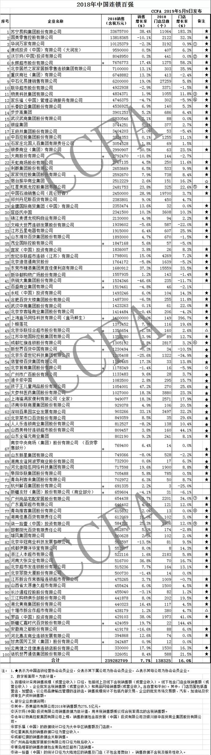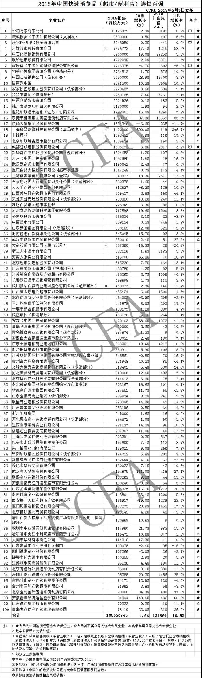 2019年5月9日,國內(nèi)連鎖經(jīng)營協(xié)會發(fā)布了2018國內(nèi)連鎖百強榜單。 2018年連鎖百強銷售規(guī)模為2.4萬億元,同比增長7.7%,占社會消費品零售總額的6.3%,比上年增長0.3個百分點。連鎖百強門店總數(shù)13.8萬個,同比增長16.0%。去除便利店門店因素(含蘇寧小店),百強門店增速為9.1%,與上年持平。 2018年,蘇寧、永輝、居然之家、銀泰、紅星美凱龍、屈臣氏、美宜佳、盒馬鮮生、信譽樓、孩子王、大參林、全家、百果園、7-11、大張、羅森、匯嘉和健之佳等18家企業(yè)實現(xiàn)了銷售和門店兩位數(shù)的同步增長。同時有30家企業(yè)的銷售額和(或)門店數(shù)與上年相比出現(xiàn)不同程度的下降。 2018年,百強線上銷售業(yè)務(wù)增長55.5%,增幅超過全國線上商品零售增幅一倍以上。超市發(fā)、卜蜂蓮花、五星電器、永輝、美宜佳、百果園、中石化易捷等企業(yè)更是實現(xiàn)了三位數(shù)的增長。去除線上銷售占比較高的蘇寧、國美、盒馬鮮生等企業(yè),百強企業(yè)線上銷售額平均占比達到2.6%,比上年提高0.8個百分點,其中超市業(yè)態(tài)占比為1.9%,比上年提高0.6個百分點。 在發(fā)展線上業(yè)務(wù)的同時,百強企業(yè)通過管理優(yōu)化,運營效率進一步提升。2018年,百強企業(yè)平均人效198萬元,比上年提高了3.0%。百強平均毛利率由上年的17.9%提高到18.3%,中位數(shù)18.1%,與上年持平。 2018年國內(nèi)連鎖百強 2018年國內(nèi)快消品(超市/便利店)連鎖百強 |