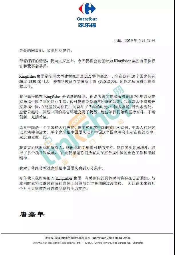 據(jù)《商業(yè)觀察家》媒體消息,家樂福國內(nèi)區(qū)總裁唐嘉年今天(6月27)上午正式辭職,家樂福華中區(qū)總經(jīng)理吳博則于昨天(6月26日)離職。 據(jù)kingfisher北京時間6月27日下午14點發(fā)布公告稱: 家樂福國內(nèi)區(qū)總裁兼首席執(zhí)行官唐嘉年(Thierry Garnier)正式宣布,自己將會被任命為Kingfisher(百安居母公司,英國翠豐集團)集團首席執(zhí)行官和董事會委員。同時,唐嘉年也表示,在未來幾個月里,他還將繼續(xù)在自己的崗位上組織與蘇寧集團的過渡交接。 與此同時,Kingfisher今天也發(fā)布公告稱, 公司今天宣布任命Thierry GARNIER為首席執(zhí)行官。Thierry將被任命為董事會執(zhí)行董事,并將接替V_ronique Laury擔任首席執(zhí)行官。他將在倫敦總部工作,并將于秋季加入公司。任命的生效日期將在最終確定后公布。 簡單說,唐嘉年將正式離開家樂福。 資料顯示,唐嘉年于2003年加入家樂福,負責家樂福法國超市多項運營管理部門職能的唐嘉年被任命為法國超市執(zhí)行總經(jīng)理。 2008年1月,被授予管理會成員,并擔任國際業(yè)務(wù)部總經(jīng)理。之后,集團任命他負責東南亞、歐洲地區(qū)、印度以及國際合作伙伴項目。 2010年,被任命為家樂福集團執(zhí)行委員會董事,國際興新市場發(fā)展總裁。 2012年,被任命為家樂福集團執(zhí)行委員會董事、集團副總裁、大國內(nèi)區(qū)總裁。 2018年,任家樂福亞太地區(qū)總裁和家樂福集團執(zhí)行委員會委員。 英國翠豐集團公告還稱,唐嘉年在擔綱家樂福集團執(zhí)行委員會成員和家樂福亞洲首席執(zhí)行官的職位上,在面臨巨大的競爭壓力和行業(yè)混亂的情況下建立了成功實施業(yè)務(wù)轉(zhuǎn)型的記錄和業(yè)績。自2012年以來,作為家樂福亞洲業(yè)務(wù)的領(lǐng)導者,他開發(fā)并實施了一項圍繞創(chuàng)新的新數(shù)字化零售、集中采購、新模式實施、電子商務(wù)和加強利益相關(guān)者關(guān)系的戰(zhàn)略。 2003年到2008年,唐嘉年擔任法國家樂福超市的常務(wù)董事,在那里,他成功地將Champion超市的形式重新改造整合為家樂福市場的標準。這種格式在法國的1000家超市推出,帶來約為130億歐元的銷售額。 在此期間,他通過將非食品銷售額增加一倍,投資自有品牌商品,改善定價結(jié)構(gòu)和重組供應(yīng)鏈,對提升業(yè)績有顯著改善。在這個成功時期之后,唐嘉年在2008年成為家樂福的國際運營總監(jiān),負責包括亞洲、拉丁美洲和歐洲各國的市場。 家樂福公告如下: 各位親愛的家樂福國內(nèi)同仁 家樂福集團于6月23日,宣布將公司在華的業(yè)務(wù)控制權(quán)移交給蘇寧易購。 過去兩年來,家樂福在國內(nèi)的業(yè)績獲得了很大的提升。一方面得益于大家積極地推動轉(zhuǎn)型計劃的實施,另一方面也是基于我們與合作伙伴的協(xié)作帶來了積極的成果。這使我們能夠更加貼近顧客,并且跟上快速變化的市場。 正如你們所知,自2018年1月起,家樂福集團就一直在尋找實力雄厚的本土合作伙伴。受益于我們家樂福國內(nèi)團隊全體家樂福人腳踏實地的工作和積極的探索創(chuàng)新,很多投資方都對家樂福國內(nèi)產(chǎn)生了極大的興趣。在過去的幾個月中,集團接觸了一些有意向的伙伴,研究過幾種方案模式。最終集團決定接受蘇寧易購的提議,即收購家樂福在國內(nèi)80%的股份。這一項提議在2019年6月22日由家樂福董事會批準。家樂福國內(nèi)公司估值為14億歐元。 蘇寧易購是蘇寧集團的子公司,國內(nèi)領(lǐng)先的零售企業(yè),一家擁有零售、金融、房地產(chǎn)等業(yè)務(wù)的國內(nèi)民營集團,其營業(yè)額超過800億美元。 家樂福與蘇寧易購業(yè)務(wù)上的強大互補性將加速家樂福國內(nèi)的發(fā)展。蘇寧易購將提供其配送方面的專業(yè)知識,完善最后一公里配送網(wǎng)絡(luò),并增強非食商品的物流能力。家樂福國內(nèi)將成為蘇寧生態(tài)圈在食品和大快消品類的主要板塊。 在這個新的組合中,家樂福保留了20%的股權(quán),在家樂福國內(nèi)監(jiān)督董事會的7個席位中占有2席。本次交易尚需通過國內(nèi)相關(guān)部門的經(jīng)營者集中反壟斷審查,預計將于2019年底生效。 對于我們大家來說,這是一次新的征程。我們中的大多數(shù)人都是和家樂福一起成長起來的,家樂福之于我們,不僅僅是雇主、更是我們的家,我們對她傾注了我們的愛。我衷心希望新的合作能夠給家樂福國內(nèi),能夠給大家?guī)砀篮玫拿魈? 唐嘉年(Thierry Garnier) 家樂福國內(nèi)區(qū)總裁兼首席執(zhí)行官 |