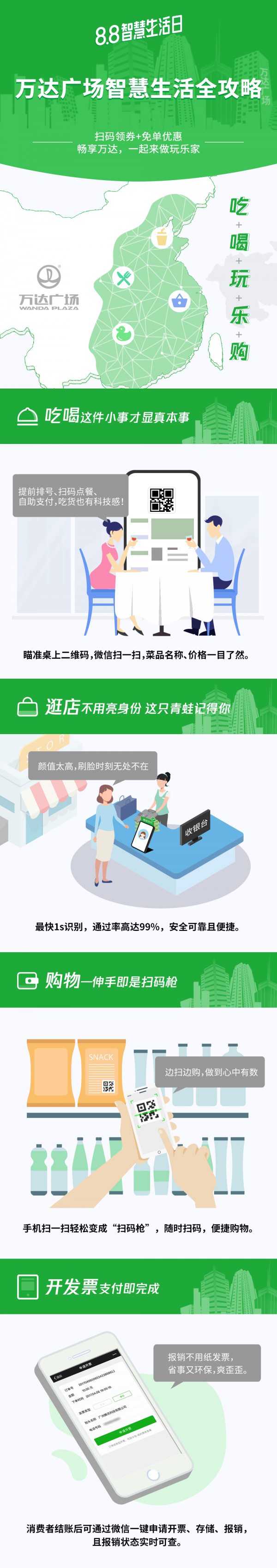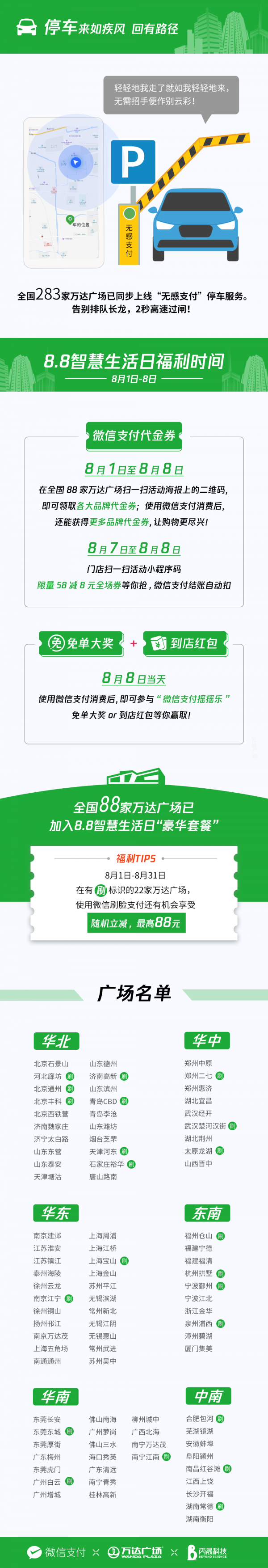 微信支付8.8智慧生活日熱浪來襲,萬達(dá)廣場“組團(tuán)”助陣! 8月1日起,消費(fèi)者在全國88家參與智慧生活日活動的萬達(dá)廣場均可享受掃碼領(lǐng)券、隨機(jī)立減等多重優(yōu)惠,在8月8日當(dāng)天使用微信支付,更有機(jī)會“搖”出免單大獎。 在其中的22家萬達(dá)廣場,消費(fèi)者還能率先體驗(yàn)微信刷臉支付,讓買單這件事更有科技感。作為微信支付智慧商圈2.0能力的“嘗鮮者”,萬達(dá)廣場與微信支付、丙晟科技三方融合,協(xié)同打造智慧商圈,帶來更便捷、智慧的消費(fèi)體驗(yàn),與用戶一起共創(chuàng)智慧生活。 88家萬達(dá)廣場整裝待發(fā) 免單優(yōu)惠大放送 參與活動的88家萬達(dá)廣場覆蓋北京、廣州、上海、東莞、廈門、南京、天津、青島等多個省市;顒悠陂g(8月1日-8日),消費(fèi)者只需使用微信掃一掃商場內(nèi)海報(bào)上的小程序碼,即可領(lǐng)取各品牌門店的代金券,完成支付后,有機(jī)會進(jìn)入領(lǐng)券頁面,領(lǐng)取更多業(yè)態(tài)、門店的代金券。同時,在8月7日至8日,消費(fèi)者還有機(jī)會領(lǐng)取滿58減8元全場代金券。 更令人驚喜的是,8月8日當(dāng)天,消費(fèi)者在線下使用微信支付完成付款后,手機(jī)搖一搖即可參與“微信支付搖搖樂”活動,有機(jī)會贏取當(dāng)筆免單或微信支付到店紅包,最高可減200元。此外,8月1日至31日,消費(fèi)者在全國22家優(yōu)選萬達(dá)廣場使用微信刷臉支付,就有機(jī)會享受最高減88元的隨機(jī)立減優(yōu)惠。 “智慧商圈2.0”能力全面覆蓋,服務(wù)體驗(yàn)再升級 2018年6月,萬達(dá)與騰訊、高燈合資成立丙晟科技,將騰訊互聯(lián)網(wǎng)技術(shù)引入萬達(dá)廣場,并通過萬達(dá)廣場小程序等載體,致力于實(shí)現(xiàn)“商場數(shù)字化”,給消費(fèi)者帶來更好的消費(fèi)體驗(yàn)。今年的8.8智慧生活日,微信支付與萬達(dá)廣場、丙晟科技攜手,借助“智慧商圈2.0”能力,以形式更豐富的優(yōu)惠券和靈活的發(fā)券渠道,向消費(fèi)者推送“福利”,“支付+核銷”的形式也讓消費(fèi)體驗(yàn)更上一層。 未來,微信支付還將向更多商圈開放流量、工具和服務(wù),幫助商圈提升運(yùn)營效率,為消費(fèi)者提供更優(yōu)質(zhì)的體驗(yàn)。 |