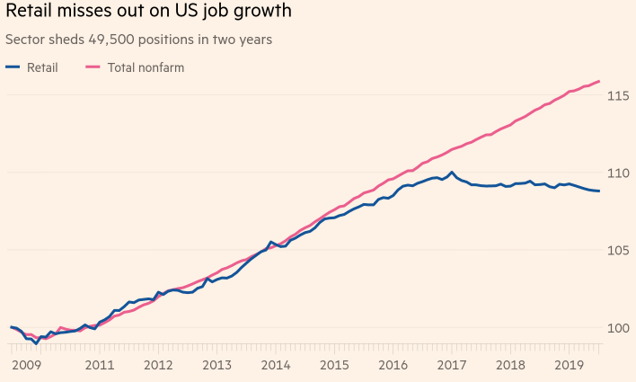 據(jù)英國(guó)《金融時(shí)報(bào)》8月5日?qǐng)?bào)道,美國(guó)零售商警告稱,特朗普的新一輪貿(mào)易關(guān)稅政策,可能會(huì)在未來(lái)幾個(gè)月導(dǎo)致更多裁員。而在過(guò)去兩年中,零售業(yè)已是美國(guó)唯一就業(yè)崗位在減少的經(jīng)濟(jì)部門。 上周五,美國(guó)勞工部公布的數(shù)據(jù)已顯示出零售業(yè)的萎靡境況。數(shù)據(jù)顯示,美國(guó)7月非農(nóng)部門新增就業(yè)崗位16.4萬(wàn),但零售業(yè)就業(yè)崗位卻是連續(xù)第六個(gè)月出現(xiàn)萎縮,同比減少4.9萬(wàn)人。百貨商店、服裝連鎖店、電子產(chǎn)品零售店的工人在裁員潮中首當(dāng)其沖,如果沒(méi)有雜貨店和汽車經(jīng)銷商的招聘支撐,零售業(yè)崗位將減少更多。 “關(guān)門潮”來(lái)襲 近年來(lái),隨著電子商務(wù)領(lǐng)域的崛起及貿(mào)易摩擦的不斷升級(jí),美國(guó)傳統(tǒng)零售業(yè)遭受了巨大打擊。 雖然據(jù)美國(guó)圣路易斯聯(lián)儲(chǔ)和美國(guó)勞工統(tǒng)計(jì)局?jǐn)?shù)據(jù),在過(guò)去兩年里,運(yùn)輸、倉(cāng)儲(chǔ)領(lǐng)域約增加了37萬(wàn)個(gè)崗位。但英國(guó)《金融時(shí)報(bào)》稱,電商巨頭亞馬遜的不斷崛起,正在改變著勞動(dòng)力市場(chǎng),零售業(yè)已經(jīng)錯(cuò)過(guò)了其他行業(yè)的就業(yè)熱潮。 英國(guó)《金融時(shí)報(bào)》統(tǒng)計(jì)2009年至2019年的就業(yè)人數(shù)時(shí)發(fā)現(xiàn),美國(guó)非農(nóng)部門就業(yè)崗位數(shù)量處于上升態(tài)勢(shì),但零售業(yè)就業(yè)崗位數(shù)量從2017年便開(kāi)始出現(xiàn)下降趨勢(shì)。 ▲數(shù)據(jù)來(lái)源:英國(guó)《金融時(shí)報(bào)》 零售業(yè)就業(yè)崗位的減少,主要是由西爾斯(Sears)及梅西百貨(Macy’s)等大型零售公司要么破產(chǎn),要么削減成本和關(guān)店所導(dǎo)致。 據(jù)CBS報(bào)道,截至2019年7月,美國(guó)已有7062家商店關(guān)閉,超過(guò)了2018年全年的關(guān)店數(shù)量(5864家),而這一數(shù)字到年底預(yù)計(jì)將超過(guò)1.2萬(wàn)。 這些關(guān)閉的門店中,包括梅西百貨(4家)、Kohl’s(8家)、沃爾瑪(17家)、家裝巨頭勞氏Lowe’s(51家)、維多利亞的秘密(53家)、西爾斯(72家)、星巴克(150家)、Gap(230家)、Fred’s(312家)、Family Dollar(390家)、Gymboree(800家)、鞋業(yè)公司Payless ShoeSource(2100家)等在內(nèi)的40家連鎖品牌。 有著超過(guò)125年歷史的西爾斯,曾是全美最大的零售商,但由于其既不能在實(shí)體零售上超越沃爾瑪,又無(wú)法在線上零售中與亞馬遜等巨頭競(jìng)爭(zhēng),終于在2018年因無(wú)法盈利關(guān)閉了大量門店并申請(qǐng)破產(chǎn)保護(hù),預(yù)計(jì)今年其還將關(guān)閉72家門店。 零售業(yè)巨頭沃爾瑪也計(jì)劃于今年關(guān)閉包括鄰里市場(chǎng)雜貨店、全尺寸折扣店以及小型“校園沃爾瑪”在內(nèi)的17家門店。 就在上周,美國(guó)家裝零售巨頭勞氏(Lowe’s)也通知數(shù)千名員工,他們將被裁員。 就連咖啡店遍布全球的星巴克,也為了在飽和的市場(chǎng)中淘汰實(shí)力較弱的門店,將于2019年內(nèi)關(guān)閉150家門店,這個(gè)數(shù)字是此前其每年關(guān)店數(shù)量(約50個(gè))的3倍。 客戶偏好的不斷變化也是零售業(yè)“關(guān)門潮”的一個(gè)重要成因。繼2018年關(guān)閉30家門店后,維多利亞的秘密今年計(jì)劃再關(guān)閉53家門店,其主要原因在于女性消費(fèi)偏好已轉(zhuǎn)向更舒適的文胸款式,以性感文胸聞名的維秘未能跟上客戶偏好的變化。 現(xiàn)在的狀況還不是最糟糕的。瑞銀(UBS)分析師表示,隨著網(wǎng)購(gòu)的持續(xù)增長(zhǎng),如果電子商務(wù)的滲透率從目前的16%上升至25%,那么到2026年,美國(guó)可能還會(huì)有7.5萬(wàn)家商店關(guān)閉。 貿(mào)易摩擦“雪上加霜” 上周,來(lái)自特朗普的最新關(guān)稅威脅,更是引發(fā)了市場(chǎng)對(duì)零售行業(yè)的擔(dān)憂。 包括Best Buy、Gap、梅西百貨等幾家全球最大零售商的股價(jià)都在上周四出現(xiàn)7%以上的下挫,標(biāo)準(zhǔn)普爾500零售指數(shù)也下跌了1.3%,零售業(yè)上市公司共蒸發(fā)了約200億美元市值。 小型零售商同樣憂心忡忡。美國(guó)特拉華州的Trey Kraus與妻子共同經(jīng)營(yíng)一家名叫卡爾頓(Carltons)的服裝店。Trey Kraus稱,公司股東會(huì)要求裁員,在進(jìn)行裁員前,他和妻子將自己填平公司的盈利。 零售業(yè)分析師警告稱,那些弱勢(shì)的商店本就在以很低的利潤(rùn)率運(yùn)營(yíng),還要應(yīng)對(duì)消費(fèi)者口味的變化、網(wǎng)購(gòu)的沖擊。對(duì)于他們來(lái)說(shuō),再增加額外的成本無(wú)疑是“雪上加霜”。 美國(guó)時(shí)裝業(yè)協(xié)會(huì)會(huì)長(zhǎng)朱莉婭·休斯表示:“對(duì)于那些本就不太穩(wěn)定的公司來(lái)說(shuō),這會(huì)很快將他們推下懸崖。” 一直以來(lái),美國(guó)零售商都在試圖將采購(gòu)和生產(chǎn)轉(zhuǎn)移到海外,并推動(dòng)供應(yīng)商承擔(dān)一部分成本,以遏制關(guān)稅的影響。 但分析師認(rèn)為,最新一波加稅要么使零售商提高價(jià)格,要么使其利潤(rùn)率受到影響。本次貿(mào)易摩擦的升級(jí),將涉及到更多的消費(fèi)品,從服裝到電子產(chǎn)品,消費(fèi)品提高的成本都將轉(zhuǎn)嫁至消費(fèi)者。 