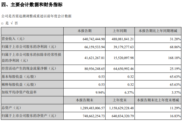 8月11日晚間,鹽津鋪?zhàn)影l(fā)布2019年半年度報告,公司2019年上半年實(shí)現(xiàn)營業(yè)收入6.41億元,同比增長31.28%;實(shí)現(xiàn)歸屬于上市公司股東的凈利潤6615.95萬元,同比增長68.86%;基本每股收益為0.53元,同比增長65.63%。 鹽津鋪?zhàn)颖硎,公司?017年2月8日上市后,經(jīng)過兩年多的戰(zhàn)略優(yōu)化調(diào)整并不斷夯實(shí)基礎(chǔ),新的產(chǎn)品戰(zhàn)略、渠道戰(zhàn)略、區(qū)域拓展戰(zhàn)略等初見成效,營業(yè)收入規(guī)模保持增長態(tài)勢;公司注重外延式發(fā)展與內(nèi)生式成長兼顧,不斷優(yōu)化各項內(nèi)部管理和資源配置,狠抓投入產(chǎn)出比,各項成本和費(fèi)用管控較好。 具體來看,2019年上半年,鹽津鋪?zhàn)拥暮媾囝惍a(chǎn)品、豆干產(chǎn)品、肉魚產(chǎn)品、魚糜產(chǎn)品、果干類產(chǎn)品、素食產(chǎn)品及薯片產(chǎn)品的營業(yè)收入均有所增長。其中,果干類產(chǎn)品實(shí)現(xiàn)營業(yè)收入4726.69萬元,同比增長550.02%,增長幅度最大;薯片產(chǎn)品和烘培類產(chǎn)品分別實(shí)現(xiàn)營業(yè)收入3200.57萬元、1.35億元,同比增長分別為150.08%、132.09%。另外,豆干類產(chǎn)品實(shí)現(xiàn)營業(yè)收入1.15億元,同比增長12.71%。 (來源/中證網(wǎng) 記者/段芳媛) |