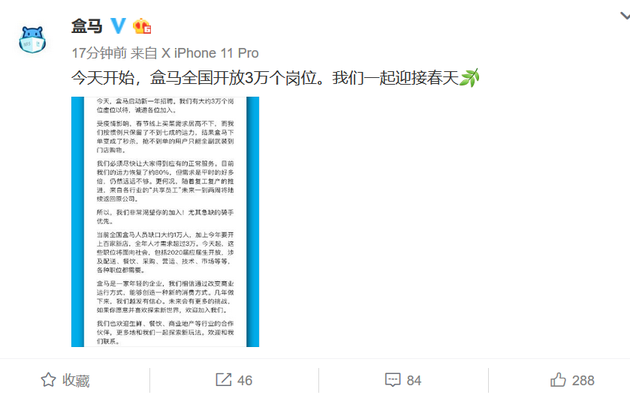 | 盒馬啟動新一年招聘,在全國開放3萬個崗位,急缺的騎手優(yōu)先。盒馬表示,受疫情影響,春節(jié)線上買菜需求居猛增,但只有不到七成運(yùn)力,下單變成秒殺。目前運(yùn)力恢復(fù)約80%,仍遠(yuǎn)遠(yuǎn)不夠。 |
