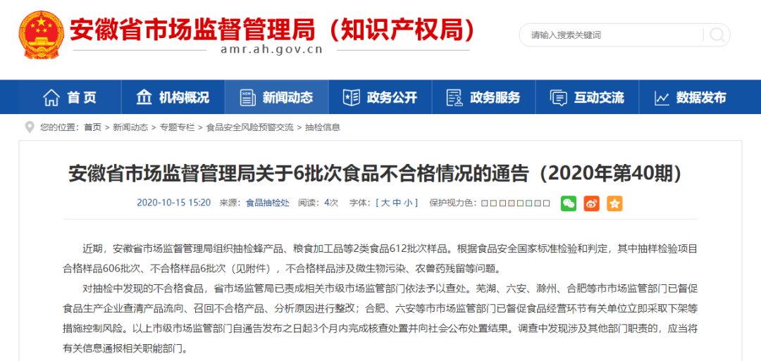 近期,安徽省市場(chǎng)監(jiān)督管理局組織抽檢蜂產(chǎn)品、糧食加工品等2類食品612批次樣品。根據(jù)食品安全國(guó)家標(biāo)準(zhǔn)檢驗(yàn)和判定,其中抽樣檢驗(yàn)項(xiàng)目合格樣品606批次、不合格樣品6批次,不合格樣品涉及微生物污染、農(nóng)獸藥殘留等問(wèn)題。 微生物污染問(wèn)題 (一)安徽哈都來(lái)商貿(mào)有限公司(合肥)銷售的、標(biāo)稱蕪湖市賀記食品有限公司生產(chǎn)的棗花蜂蜜,菌落總數(shù)不符合食品安全國(guó)家標(biāo)準(zhǔn)。檢驗(yàn)機(jī)構(gòu)為安徽省產(chǎn)品質(zhì)量監(jiān)督檢驗(yàn)研究院。 (二)六安開發(fā)區(qū)潤(rùn)家超市銷售的、標(biāo)稱六安市綠植源蜂業(yè)有限公司生產(chǎn)的棗花蜂蜜(生產(chǎn)日期:2020/1/3),菌落總數(shù)不符合食品安全國(guó)家標(biāo)準(zhǔn)。檢驗(yàn)機(jī)構(gòu)為安徽省產(chǎn)品質(zhì)量監(jiān)督檢驗(yàn)研究院。 (三)六安開發(fā)區(qū)潤(rùn)家超市銷售的、標(biāo)稱六安市綠植源蜂業(yè)有限公司生產(chǎn)的紫云英蜂蜜,菌落總數(shù)不符合食品安全國(guó)家標(biāo)準(zhǔn)。檢驗(yàn)機(jī)構(gòu)為安徽省產(chǎn)品質(zhì)量監(jiān)督檢驗(yàn)研究院。 (四)合肥包河大潤(rùn)發(fā)商業(yè)有限公司銷售的、標(biāo)稱滁州市華露蜂產(chǎn)品有限公司生產(chǎn)的洋槐蜂蜜,菌落總數(shù)不符合食品安全國(guó)家標(biāo)準(zhǔn)。檢驗(yàn)機(jī)構(gòu)為安徽省產(chǎn)品質(zhì)量監(jiān)督檢驗(yàn)研究院。 (五)合肥聯(lián)家商貿(mào)發(fā)展有限公司肥西分公司銷售的、標(biāo)稱安徽省百春制藥有限公司(合肥)生產(chǎn)的洋槐蜜,菌落總數(shù)不符合食品安全國(guó)家標(biāo)準(zhǔn)。檢驗(yàn)機(jī)構(gòu)為安徽省產(chǎn)品質(zhì)量監(jiān)督檢驗(yàn)研究院。 農(nóng)獸藥殘留問(wèn)題 六安開發(fā)區(qū)潤(rùn)家超市銷售的、標(biāo)稱六安市綠植源蜂業(yè)有限公司生產(chǎn)的棗花蜂蜜(生產(chǎn)日期:2019/9/18),諾氟沙星、菌落總數(shù)均不符合食品安全國(guó)家標(biāo)準(zhǔn)。檢驗(yàn)機(jī)構(gòu)為安徽省產(chǎn)品質(zhì)量監(jiān)督檢驗(yàn)研究院。 (來(lái)源/合肥晚報(bào)) |