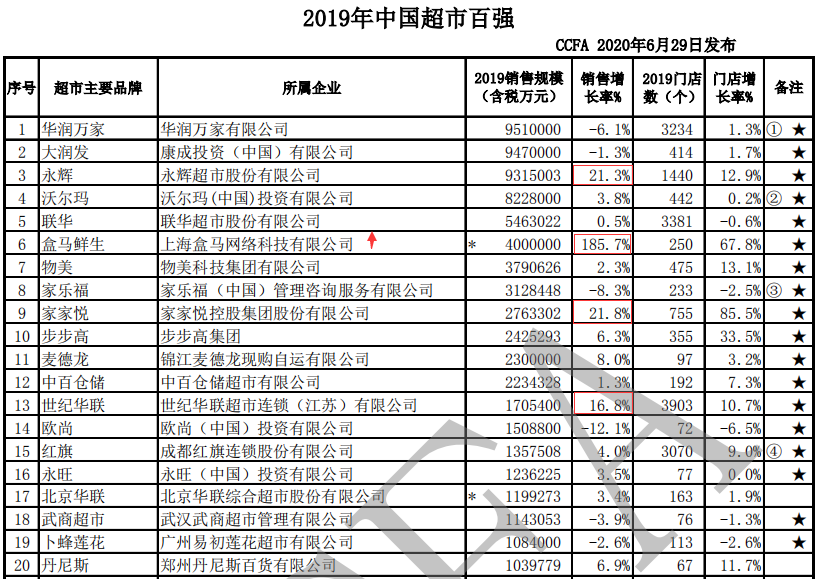 據(jù)中國(guó)零售網(wǎng)最新消息,6月29日,中國(guó)連鎖經(jīng)營(yíng)協(xié)會(huì)發(fā)布了《2019年中國(guó)超市百?gòu)?qiáng)》。 華潤(rùn)、大潤(rùn)發(fā)、永輝、沃爾瑪、聯(lián)華、盒馬鮮生、物美、家樂福、家家悅、步步高位列榜單前10位。 下面跟著中國(guó)零售網(wǎng)小編一起來看看吧。 第一名:華潤(rùn)萬家,所屬華潤(rùn)萬家有限公司,2019年?duì)I收951億元,銷售增長(zhǎng)-6.1%;門店數(shù)達(dá)到3234個(gè),門店增長(zhǎng)1.3%。 第二名:大潤(rùn)發(fā),所屬康成投資(中國(guó))有限公司,2019年?duì)I收947億元,銷售額增長(zhǎng)-1.3%;門店數(shù)達(dá)到414個(gè),門店增長(zhǎng)1.7%。 第三名:永輝超市,所屬永輝超市股份有限公司,2019年?duì)I收931.5億元,銷售額增長(zhǎng)21%;門店數(shù)達(dá)到1440個(gè),門店增長(zhǎng)12.9%。 第四名:沃爾瑪超市,所屬沃爾瑪(中國(guó))投資有限公司,2019年?duì)I收822.8億元,銷售額增長(zhǎng)3.8%;門店數(shù)達(dá)到442個(gè),門店增長(zhǎng)0.2%。 第五名:聯(lián)華超市,所屬聯(lián)華超市股份有限公司,2019年?duì)I收546.3億元,銷售額增長(zhǎng)0.5%;門店數(shù)達(dá)到3381個(gè),門店增長(zhǎng)-0.6%。 第六名:盒馬鮮生,所屬上海盒馬網(wǎng)絡(luò)科技有限公司,2019年?duì)I收400億元,銷售額增長(zhǎng)185.7%;門店數(shù)達(dá)到250個(gè),門店增長(zhǎng)67.8%。 第七名:物美超市,所屬物美科技集團(tuán)有限公司,2019年?duì)I收379.06億元,銷售額增長(zhǎng)2.3%;門店數(shù)達(dá)到475個(gè),門店增長(zhǎng)13.1%。 第八名:家樂福,所屬家樂福(中國(guó))管理咨詢服務(wù)有限公司,2019年?duì)I收312.84億元,銷售額增長(zhǎng)-8.3%;門店數(shù)達(dá)到233個(gè),門店增長(zhǎng)-2.5%。 第九名:家家悅,所屬家家悅控股集團(tuán)股份有限公司,2019年?duì)I收276.33億元,銷售額增長(zhǎng)21.8%;門店數(shù)達(dá)到755個(gè),門店增長(zhǎng)85.5%。 第十名:步步高,所屬步步高集團(tuán),2019年?duì)I收242.53億元,銷售額增長(zhǎng)6.3%;門店數(shù)達(dá)到355個(gè),門店增長(zhǎng)33.5%。 |