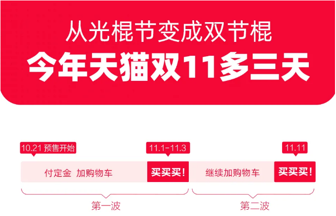 10月20日,天貓正式發(fā)布新一代“天貓雙11全球狂歡季”,代號:雙節(jié)棍。 此次升級最大的變化是,雙11消費(fèi)不再僅局限于11月11日當(dāng)天,消費(fèi)者可以分兩波購買,具體時段為11月1日-3日、11月11日。這意味著,今年雙11比以往多了3天,消費(fèi)者11月1日起可以付預(yù)售商品的尾款,提前10天收貨。 |