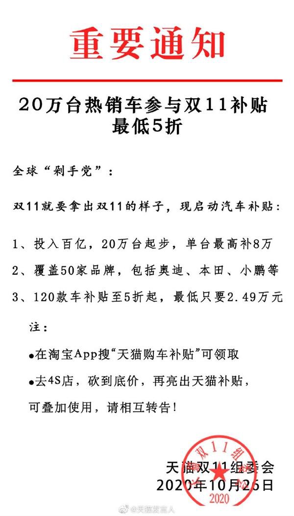 今日,天貓發(fā)言人發(fā)布消息,“買車嗎?五折的那種”,揭開(kāi)雙十一購(gòu)車補(bǔ)貼活動(dòng)的大幕。 據(jù)其介紹,此次的雙11購(gòu)車補(bǔ)貼活動(dòng)力度空前的大,投入百億資金,補(bǔ)貼車輛20萬(wàn)臺(tái)起步,單臺(tái)最高直補(bǔ)8萬(wàn)元。覆蓋50多個(gè)汽車品牌,奧迪、本田、小鵬汽車都在列。 參與方式為,在淘寶App搜索“天貓購(gòu)車補(bǔ)貼”后,即可領(lǐng)取專屬購(gòu)車補(bǔ)貼。值得注意的是,相較于此前其它網(wǎng)上賣車的方式,補(bǔ)貼金額基于廠商指導(dǎo)價(jià)誠(chéng)意不足的做法,天貓此次的補(bǔ)貼,是實(shí)打?qū)嵉陌l(fā)到了購(gòu)車消費(fèi)者手中。 獲得購(gòu)車補(bǔ)貼券后,消費(fèi)者可自行前往4S店看車、選車、然后和4S店議價(jià)。個(gè)人憑本事砍到“底價(jià)”后,可再亮出天貓補(bǔ)貼,疊加享受更多優(yōu)惠。 (來(lái)源 / 快科技) |