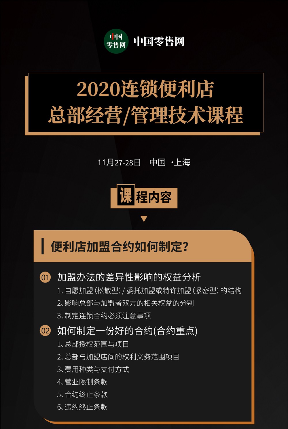 課程背景 近日,商務(wù)部《關(guān)于開展便利店品牌化連鎖化三年行動的通知》,要求到 2022 年,全國品 牌化連鎖化便利店總量達到 30 萬家,銷售額累計增長超過 50%,全國中等以上城市每百 萬人口不少于 200 家門店,連鎖便利店 24 小時營業(yè)門店的比例不低于 30%(含無人零售 店),成為服務(wù)民生、便利消費的重要載體。 根據(jù)《2020 中國便利店發(fā)展報告》顯示,2019 年,我國便利店的規(guī)模達到了 13.2 萬家, 實現(xiàn)銷售額 2556 億元,同比增長 13%,行業(yè)規(guī)模保持快速增長但增速有所放緩。 同時, 便利店行業(yè)的單店日均銷售額增速為 4%,雖然較上年同期增速增加了 1 個百分點,但仍然 處于低位狀態(tài)。這也意味著,還遠遠達不到通知的需求,便利店還有很大的發(fā)展空間。 便利店企業(yè)想要快速擴張,除了政策、資金、人員外,還需要過硬基礎(chǔ)知識,比如開發(fā)商圈與經(jīng)營、加盟體系的搭建、督導(dǎo)管理、賣場管理、陳列管理等等。《2020連鎖便利店經(jīng)營與管理課程》這堂課,我們將給您帶來這些方面的講解,希望給您帶來一些啟發(fā)和參考。 課程對象 連鎖便利店負責(zé)人、運營總監(jiān)、督導(dǎo)、開發(fā)、優(yōu)秀店長等 課程亮點 1、打造強大的總部經(jīng)營,更好的做好門店服務(wù)與支持。 2、掌握7-11便利店的商圈開發(fā)與經(jīng)營。 3、學(xué)習(xí)7-11便利店區(qū)督導(dǎo)的賣場與商品管理。 4、 連鎖便利店制定適合自己的加盟合約? 5、講解/參觀學(xué)習(xí)上海全家、7-11多家特色門店。 |