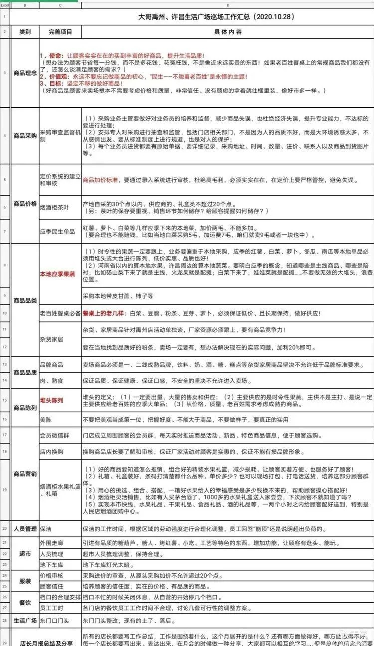 會(huì)議時(shí)間:2020年10月28日 巡店:禹州店、許昌生活廣場(chǎng)店 會(huì)議地點(diǎn):胖東來(lái)時(shí)代廣場(chǎng)六樓 參會(huì)人員:各部門第一主管 于東來(lái)巡店:胖東來(lái)禹州店開(kāi)業(yè)后結(jié)果并不好,還講了這22條! 1、愛(ài)是信任,意識(shí)需要轉(zhuǎn)化行動(dòng) 在做事上,大家總是停留在思想意識(shí)層面,不能把意識(shí)形態(tài)轉(zhuǎn)化到實(shí)際的行動(dòng)上,是光說(shuō)不做!不要光嘴上說(shuō)愛(ài)、愛(ài)、愛(ài),而是行動(dòng)上體現(xiàn)出來(lái)!如果賣的商品讓顧客多花錢,是愛(ài)嗎?如果讓顧客信任不了,是愛(ài)嗎? 2、需要發(fā)揮主觀能動(dòng)性 思維固化是最重要、最需要改變的問(wèn)題,腦子看起來(lái)很聰明,基礎(chǔ)也很扎實(shí),唯獨(dú)就是缺乏創(chuàng)新的思維,所以要被推動(dòng)著走、從來(lái)不會(huì)想著主動(dòng)解決問(wèn)題、主動(dòng)提升。 3、圍繞客戶價(jià)值,不是利益 做生意的價(jià)值是想著讓顧客好,幫助顧客解決問(wèn)題,而不是想辦法從顧客身上獲取利益,圍繞著顧客價(jià)值怎么做都好,光想利益只有死路。 4、不要讓顧客猶豫 當(dāng)顧客只是一直逛、猶豫的時(shí)候,說(shuō)明你不能讓他足夠信任,一定要去考慮為什么?是什么原因讓他產(chǎn)生不了信任? 5、賣場(chǎng)發(fā)現(xiàn)不了問(wèn)題是理念缺失 在賣場(chǎng)里發(fā)現(xiàn)不了問(wèn)題,主要還是因?yàn)槔砟畹娜笔,不知道自己工作的價(jià)值,比如做超市的價(jià)值,做醫(yī)藥的價(jià)值,做餐飲的價(jià)值?從來(lái)沒(méi)有想過(guò)承擔(dān)社會(huì)責(zé)任,如果自己的腦子都迷茫,都不知道為了什么,那就完全沒(méi)有意義了。 6、跟蹤、落實(shí)、監(jiān)督 工作扎不扎實(shí),執(zhí)行到不到位,光靠說(shuō)是沒(méi)用的,必須要跟蹤、落實(shí)和監(jiān)督,上級(jí)主管和基層是有差距的。要實(shí)實(shí)在在的走到下面操作,如果做超市不清楚顧客的餐桌需要什么,如果做服裝不知道顧客購(gòu)買實(shí)不實(shí)在……還憑什么說(shuō)用心、說(shuō)價(jià)值呢? 7、站在老百姓的角度解決民生問(wèn)題 經(jīng)營(yíng)出現(xiàn)問(wèn)題,暴露的是深層次問(wèn)題,這說(shuō)明不用心,也說(shuō)明上面沒(méi)有教好,所以今后要學(xué)會(huì)站在老百姓的角度上為他們解決民生的問(wèn)題,不要只是站在空中樓閣,要干實(shí)事。 真正的去考慮怎么讓他們的生活過(guò)得放心一些,不要光想著自己掙多少錢?如果是帶著這樣的功利心,就不要想著去領(lǐng)這個(gè)團(tuán)隊(duì),因?yàn)椴慌!本?lái)這是一個(gè)很崇高很神圣的工作,但是因?yàn)椴欢,卻把它變成了一個(gè)很骯臟很齷齪的工作。 8、踏實(shí)做事,調(diào)節(jié)細(xì)節(jié),讓人放心,信任 慢慢的從思想觀念上認(rèn)識(shí),一步一步的進(jìn)行轉(zhuǎn)變,醫(yī)藥、超市、餐飲,任何一個(gè)部門都要踏踏實(shí)實(shí)的去做事,從商品等各個(gè)方面上去調(diào)節(jié),要讓人放心,讓人信任! 如果連這都做不到,連這個(gè)概念都沒(méi)有了,那你做的工作也是在害人,不但是在害這個(gè)企業(yè),也是在害這個(gè)團(tuán)隊(duì),更是在害自己!所以要做得頂天立地、坦坦蕩蕩,這樣也輕松、也快樂(lè)!不要讓自己做迷了,你們現(xiàn)在已經(jīng)迷了。 9、禹州店結(jié)果不好,不是表現(xiàn)不好,是表面工作多 禹州店的結(jié)果不好,實(shí)際上不是因?yàn)楸憩F(xiàn)不好,而是大家忘了初心,把所有應(yīng)該去做的事情,都做成了表面工作。 10、工作工時(shí)安排合理性至關(guān)重要 人員管理、員工感受雖然看似不顯,但實(shí)際是很深度的東西。特別是對(duì)工時(shí)、工作安排的合理性!只要不合理,員工情緒就會(huì)低落,心里不舒服、窩工、不科學(xué),這影響非常非常大!所以該休息的時(shí)候必須休息,不忙的時(shí)候不賣也讓員工休息,把這些調(diào)節(jié)好。 11、我開(kāi)超市是為了什么? 各個(gè)部門要弄清楚:我活著是為了什么?我開(kāi)超市是為了什么?我做餐飲是為了什么?做服裝是為了什么?是哪個(gè)部門就要搞明白自己的價(jià)值觀是什么?使命是什么?愿景是什么? 在公司大的信仰價(jià)值觀之下,還有部門涉及到工作的責(zé)任、目標(biāo)、使命、愿景等等?我們一定要對(duì)這些非常清晰,這是方向,一定要制定,才不會(huì)迷茫、迷失! 12、像法律一樣做工作 各項(xiàng)工作一定要逐步的用標(biāo)準(zhǔn)來(lái)規(guī)范和約束,討論、制定、執(zhí)行落實(shí),保證是圍繞著理念展開(kāi),就像法律一樣。 13、文化、結(jié)果 用文化支撐經(jīng)營(yíng),用結(jié)果體現(xiàn)文化。 14、靜心工作、細(xì)節(jié)體現(xiàn) 引導(dǎo)員工靜心的工作狀態(tài),比如上貨時(shí)把商品拿在手里的輕重就是細(xì)節(jié)上的體現(xiàn)。當(dāng)你不愛(ài)時(shí)就是個(gè)搬運(yùn)工,但是當(dāng)你熱愛(ài)時(shí)就像個(gè)天使!這就是心境的差異!要教給我們的員工,這樣踏踏實(shí)實(shí)、不浮躁、慢慢的去做! 15、打開(kāi)思想,沉淀行動(dòng),著力方法 思想打開(kāi)了,方法多得是、各種各樣,關(guān)鍵就在于沒(méi)有沉下來(lái)。做一件事沒(méi)有真正領(lǐng)會(huì)到它的價(jià)值,沒(méi)