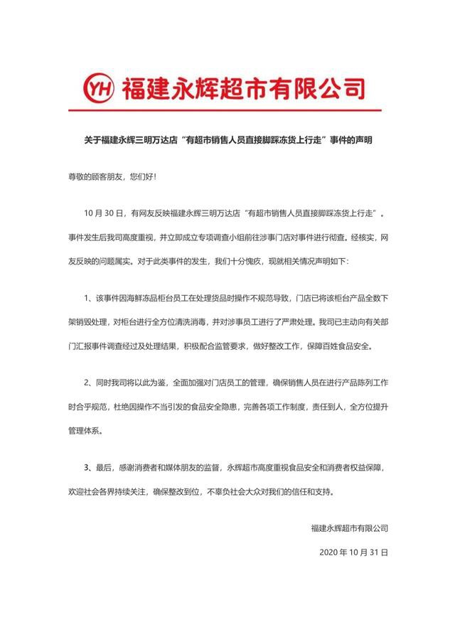 近日,有網(wǎng)友在三明市萬達(dá)永輝超市拍攝顯示,該超市工作人員在整理商品時(shí),竟然直接腳踩在冷凍魚蝦上行走。這讓不少網(wǎng)友覺得非常擔(dān)憂,還有人直呼“太惡心”、“員工培訓(xùn)沒做好”、“食品安全堪憂”。 事后,福建永輝超市在官方聲明中表示,門店己將該柜臺產(chǎn)品全數(shù)下架銷毀處理,并完成了柜臺的全方位清洗消毒,同時(shí)也對涉事員工進(jìn)行了嚴(yán)肅處理。 聲明中表示,永輝超市將加強(qiáng)對門店員工的管理,確保銷售人員在進(jìn)行產(chǎn)品工作陳列時(shí)合乎規(guī)范,杜絕因操作不當(dāng)引起的食品安全隱患。 |
