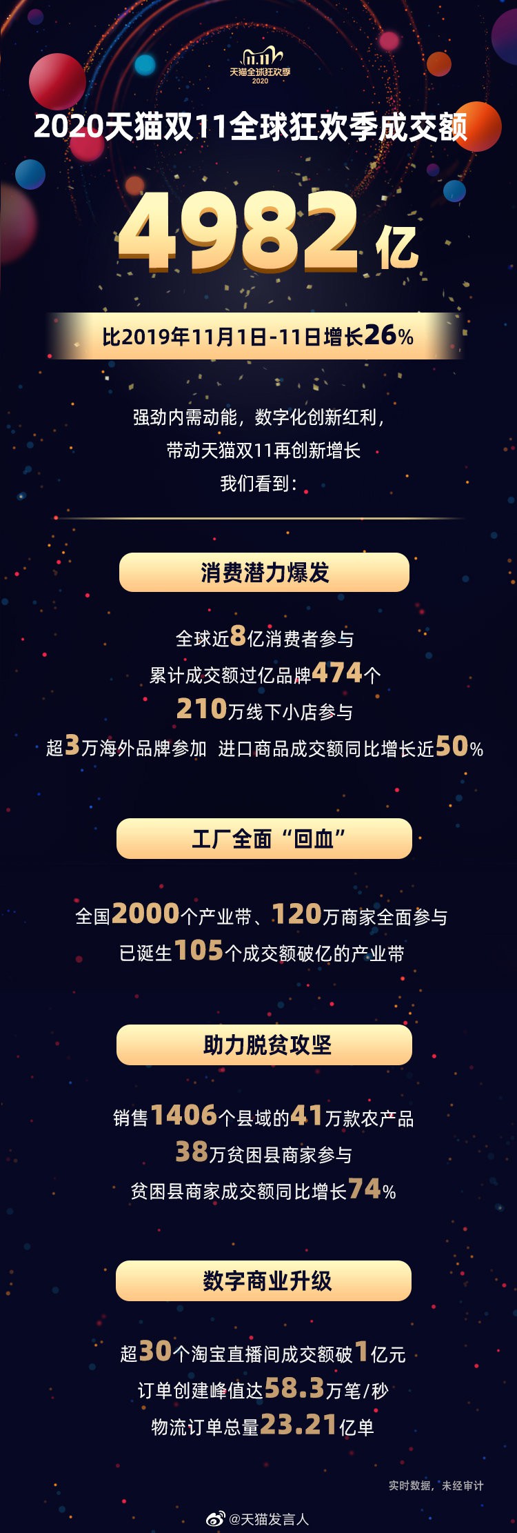 據(jù)官方數(shù)據(jù),2020天貓“雙11”全球狂歡季成交額達到4982億,超過450個品牌成交額過億。實時物流訂單量突破22.5億單,約等于2010年全年中國快遞量的總和。 淘寶天貓總裁蔣凡透露,按照同周期、同口徑比較,今年雙11期間的GMV比去年同期增長了1032億,增速是26%,這是過去三年來最高的增速。 據(jù)介紹,截至目前,共有31766個海外品牌、210萬線下小店參與本次雙十一,105個產(chǎn)業(yè)帶成交額過1億元。 天貓方面預(yù)計,今年天貓雙11吸引超過8億消費者、25萬品牌、500萬商家共同參與,是覆蓋面最廣、參與度最高的一屆。更長的銷售周期給 |