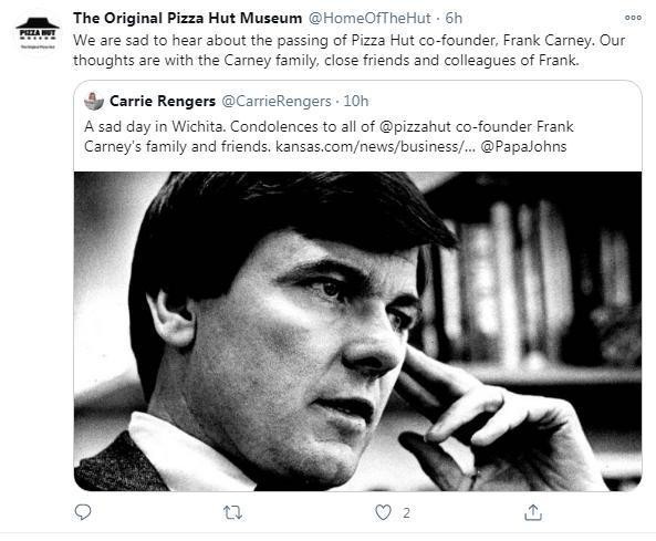 12月3日電 綜合報(bào)道,當(dāng)?shù)貢r(shí)間12月2日,美國(guó)披薩連鎖品牌必勝客創(chuàng)始人之一弗蘭克·卡尼(Frank Carney)因肺炎病逝,享年82歲。他與哥哥于1958年在堪薩斯州威奇托市,開始攜手創(chuàng)建必勝客“披薩帝國(guó)”。 據(jù)《威奇托每日鷹報(bào)》報(bào)道,卡尼近日才從新冠肺炎中康復(fù),不過(guò)他已受阿茲海默癥之苦逾10年?岬钠拮雍透绺绲(Dan Carney)對(duì)當(dāng)?shù)孛襟w表示,卡尼于凌晨4時(shí)30分在威奇托一處老人公寓中離世。 1958年,當(dāng)時(shí)19歲的卡尼是威奇托州立大學(xué)的一名學(xué)生,他與26歲的兄長(zhǎng)丹向母親借了600美元,在家族所有的卡尼市場(chǎng)附近開啟披薩事業(yè)。 1977年,百事公司以3億美元買下必勝客。后來(lái)這些年,卡尼跨足各式各樣的商業(yè)活動(dòng),包括其他食品企業(yè)、房地產(chǎn)、石油與天然氣、汽車業(yè)、租賃及休閑產(chǎn)業(yè)。 據(jù)報(bào)道,卡尼投資了約20間企業(yè),其中僅5間有盈利。不過(guò),丹說(shuō),“他只是在積極地創(chuàng)造一些不同的東西。” 資料圖:弗蘭克·卡尼與哥哥丹,兩人聯(lián)合創(chuàng)辦了必勝客。圖片來(lái)源:當(dāng)?shù)孛襟w視頻報(bào)道截圖。 必勝客的一位發(fā)言人稱,任何欣賞必勝客標(biāo)志性的紅色屋頂和美味披薩的人,都能感受到弗蘭克·卡尼的創(chuàng)業(yè)精神,并被其影響!八摹z產(chǎn)’,將在全美乃至世界各地的大小城市、在那些幾十年來(lái)把人們聚集在一起的餐廳里流傳! (來(lái)源/中新網(wǎng)) |