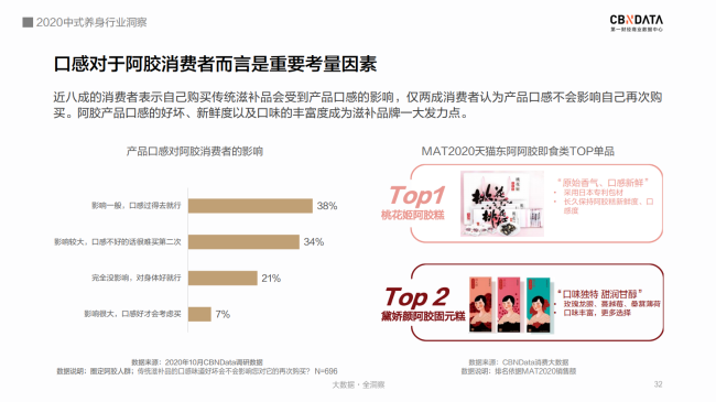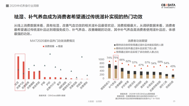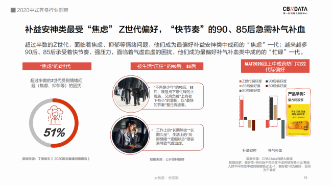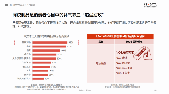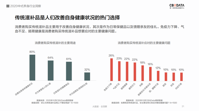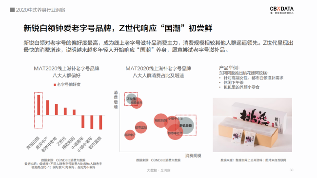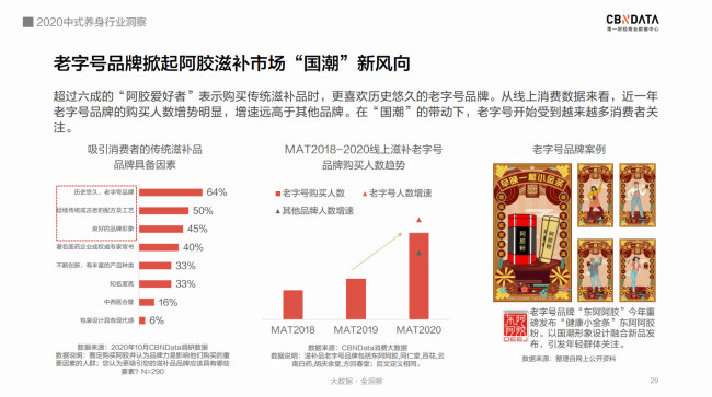 CBNData發(fā)布《2020中式養(yǎng)身行業(yè)洞察》 “奶茶不要奶,可樂加黨參,破洞褲里穿秋褲,啤酒杯中泡枸杞……” 許多人對年輕人的養(yǎng)身潮的理解還停留在“朋克養(yǎng)身”的段子上。 殊不知,當(dāng)代年輕人,已經(jīng)默默地將視線轉(zhuǎn)向“補氣、養(yǎng)血、祛濕、助眠……”這些“動真格”的養(yǎng)身方法上了。 補氣吃中(成)藥,補血有阿膠(糕)。在他們手里,中式養(yǎng)身這個看上去不那么酷的事情,儼然成為了又in又剛需的新時尚。 事實上,“養(yǎng)身惜命”的絕不僅僅是少數(shù)派。隨著國民健康意識逐漸提升,“健康中國”“大健康時代”下的中式養(yǎng)身已經(jīng)成為公眾一種普遍的生活態(tài)度。 12月7日,第一財經(jīng)商業(yè)數(shù)據(jù)中心(CBNData)發(fā)布《2020中式養(yǎng)身行業(yè)洞察》(以下簡稱《報告》),基于細(xì)分行業(yè)洞察,圍繞中藥調(diào)理、傳統(tǒng)滋補等中式養(yǎng)身熱門趨勢,深入探索傳統(tǒng)養(yǎng)身通過“國潮”化,占領(lǐng)年輕消費者心智的新進(jìn)路。 CBNData《報告》顯示: 1) 健康養(yǎng)身理念深入人心,國民在醫(yī)療保健方面花費增長顯著,過半數(shù)人認(rèn)為自己處于亞健康狀態(tài),超八成重視養(yǎng)身。 2) 疫情帶動中醫(yī)藥走紅,線上中成藥市場規(guī)模逐漸擴大,一二線城市女性是消費主力,補益安神、補氣補血、抗菌消炎等中成藥廣受歡迎。 3) 傳統(tǒng)滋補養(yǎng)身呈現(xiàn)年輕化趨勢,東阿阿膠等老字號阿膠品牌帶動滋補市場“國潮”新風(fēng)向,近六成消費者青睞“補氣養(yǎng)血”的阿膠制品,其中新銳白領(lǐng)偏好老字號,Z世代更喜歡“輕滋補”即食產(chǎn)品。 后疫情時代 中式養(yǎng)身成行業(yè)熱點 隨著國民對健康問題的關(guān)注度越來越高,超過半數(shù)的人認(rèn)為自己處于亞健康狀態(tài)。被各種健康問題困擾的人們在醫(yī)療保健上投入更多的花費。CBNData《報告》顯示,有超過8成的人重視養(yǎng)身。而隨著中醫(yī)藥在抗擊新冠疫情中大顯身手,以中藥調(diào)理和傳統(tǒng)滋補為主流的中式養(yǎng)身方式逐漸成為熱門。 由于中醫(yī)藥“走紅”的推動作用,線上中成藥市場近一年來規(guī)模迅速擴大,越來越多消費者看重中藥調(diào)理副作用少、使用方便、療效確切等優(yōu)點,希望通過中藥調(diào)理達(dá)到日常保健、治未病的目的。根據(jù)CBNData《報告》,線上中成藥消費人數(shù)增速在MAT20反超線上整體醫(yī)藥消費人數(shù)增速,中成藥市場不容小覷。 CBNData《報告》顯示,中成藥養(yǎng)身正吸引越來越多的新鮮血液加入。年輕一代、一二線城市消費者在中成藥的消費上均呈現(xiàn)出增速高、占比大的特點。女性明顯高于男性。其中,Z世代偏好補益安神類,90后、85后青睞補氣補血。此外,與防疫相關(guān)的抗菌消炎類也增長明顯,說明中成藥已經(jīng)承擔(dān)起消費者日常保健、健康維護(hù)的角色。 占領(lǐng)Z世代心智 傳統(tǒng)滋補市場打開新局面 Z世代與之前代際的健康觀點大不相同,他們更看重“養(yǎng)和防”,因此對在免疫力、氣血、腸胃健康等方面具有改善作用的傳統(tǒng)滋補品更為青睞。 根據(jù)CBNData《報告》,線上傳統(tǒng)滋補消費市場近3年規(guī)模加速增長,呈現(xiàn)年輕化趨勢,且四線及以下城市消費占比和增速明顯提升。其中,女性消費者更愿意投資在傳統(tǒng)滋補來養(yǎng)身。從消費數(shù)據(jù)看,祛濕、改善氣血等功效的相關(guān)滋補品最受歡迎。 補氣養(yǎng)血“超強助攻” 老字號阿膠引領(lǐng)“輕滋補”新風(fēng)尚 補氣養(yǎng)血是消費者選擇中式養(yǎng)身的主要訴求,而飽受氣血不足困擾的人群中,有六成偏好選擇阿膠制品來進(jìn)行日常調(diào)理。CBNData《報告》顯示,以東阿阿膠為榜首的阿膠制品成為傳統(tǒng)滋補市場的“黑馬”,展現(xiàn)出飛速的消費增長。近七成消費者購買阿膠制品時以“功效”作為首要因素。 在“國潮”崛起的趨勢下,歷史悠久、配方古老的老字號阿膠品牌紛紛響應(yīng)Z世代消費者追求高效、便捷、顏值的潮流趨勢,疊加本身良好品牌形象的優(yōu)勢,變身“國潮”新風(fēng)尚引領(lǐng)者,受到了超過六成消費者的青睞。老字號品牌東阿阿膠今年就重磅推出了“健康小金條”東阿阿膠粉,從產(chǎn)品理念到形象到包裝都契合年輕人對“國潮”的審美,一經(jīng)推出引發(fā)年輕群體關(guān)注。 根據(jù)CBNData《報告》,“熱愛”老字號的消費者中,新銳白領(lǐng)是不折不扣的消費主力,而Z世代消費者貢獻(xiàn)了最快的消費增速。作為更喜歡“國潮養(yǎng)身”的群體,年輕一族愿意嘗試可以方便快捷食用的老字號產(chǎn)品。如東阿阿膠的桃花姬阿膠糕,就是白領(lǐng)和年輕女性包包里常備的健康小零食。 CBNData《報告》顯示,購買門檻更低、食用方式更便捷、產(chǎn)品更有熱度的“輕滋補”即食阿膠產(chǎn)品成為Z世代購買的主力,阿膠糕、果凍、軟糖等最受消費者喜歡,阿膠糕成為推動阿膠產(chǎn)品增長的主力軍?诟小⑿迈r度、口味豐富度也成為消費者購買決策的重要影響因素。 對于深受中華傳統(tǒng)滋補、飲食文化滋養(yǎng)的中國人來說,滋補養(yǎng)身的需求其實從未改變。而經(jīng)受了疫情的考驗,以中藥調(diào)理