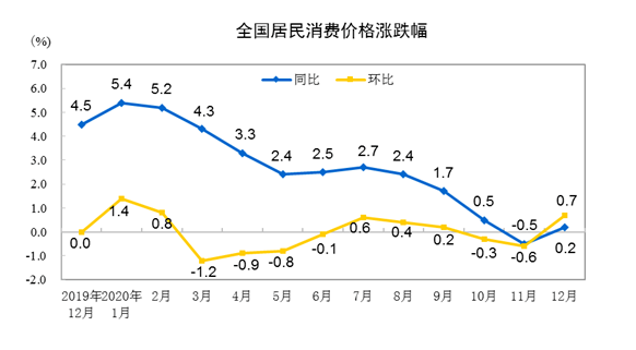 1月11日,國家統(tǒng)計局公布了2020年12月及2020年全年的全國居民消費價格數(shù)據(jù)。 2020年12月份,全國居民消費價格同比上漲0.2%。其中,城市上漲0.2%,農(nóng)村上漲0.2%;食品價格上漲1.2%,非食品價格持平;消費品價格上漲0.2%,服務價格上漲0.3%。 12月份,全國居民消費價格環(huán)比上漲0.7%。其中,城市上漲0.7%,農(nóng)村上漲0.9%;食品價格上漲2.8%,非食品價格上漲0.1%;消費品價格上漲1.2%,服務價格持平。 2020年全年,全國居民消費價格比上年上漲2.5%。 12月份,食品煙酒類價格同比上漲1.4%,影響CPI(居民消費價格指數(shù))上漲約0.44個百分點。食品中,鮮菜價格上漲6.5%,影響CPI上漲約0.17個百分點;鮮果價格上漲6.5%,影響CPI上漲約0.11個百分點;水產(chǎn)品價格上漲1.7%,影響CPI上漲約0.03個百分點;畜肉類價格上漲0.6%,影響CPI上漲約0.04個百分點,其中豬肉價格下降1.3%,影響CPI下降約0.06個百分點;蛋類價格下降10.8%,影響CPI下降約0.07個百分點。 國家統(tǒng)計局城市司高級統(tǒng)計師董莉娟分析指出,12月份,各地區(qū)各部門鞏固拓展疫情防控和經(jīng)濟社會發(fā)展成果,居民消費需求持續(xù)增長,同時受特殊天氣以及成本上升影響,CPI由降轉(zhuǎn)漲。 從環(huán)比看,CPI由上月下降0.6%轉(zhuǎn)為上漲0.7%。其中,食品價格由上月下降2.4%轉(zhuǎn)為上漲2.8%,影響CPI上漲約0.62個百分點。 食品中,受持續(xù)低溫天氣影響,鮮菜、鮮果的生產(chǎn)和儲運成本增加,價格分別上漲8.5%和3.5%;隨著元旦春節(jié)到來,消費需求季節(jié)性增加,同時飼料成本有所上升,豬肉價格由上月下降6.5%轉(zhuǎn)為上漲6.5%,羊肉價格由上月持平轉(zhuǎn)為上漲2.6%,雞蛋價格由上月下降1.6%轉(zhuǎn)為上漲2.9%。非食品價格由上月下降0.1%轉(zhuǎn)為上漲0.1%,影響CPI上漲約0.11個百分點。 非食品中,受國際原油價格波動影響,汽油、柴油和液化石油氣價格分別上漲5.2%、5.8%和3.0%,合計影響CPI上漲約0.10個百分點。 從同比看,CPI由上月下降0.5%轉(zhuǎn)為上漲0.2%。其中,食品價格由上月下降2.0%轉(zhuǎn)為上漲1.2%,影響CPI上漲約0.26個百分點。食品中,鮮菜價格上漲6.5%,漲幅比上月回落2.1個百分點;鮮果價格上漲6.5%,漲幅擴大2.9個百分點;牛肉和羊肉價格均上漲4.6%,漲幅均有擴大;豬肉價格下降1.3%,降幅收窄11.2個百分點;雞蛋、雞肉和鴨肉價格分別下降11.9%、13.5%和9.2%,降幅均有收窄。非食品價格由上月下降0.1%轉(zhuǎn)為持平。 非食品中,交通和通信價格下降3.1%,其中汽油和柴油價格分別下降14.8%和16.2%;醫(yī)療保健價格上漲1.3%;教育文化和娛樂價格上漲0.9%?鄢称泛湍茉磧r格的核心CPI同比上漲0.4%,漲幅比上月回落0.1個百分點。 |