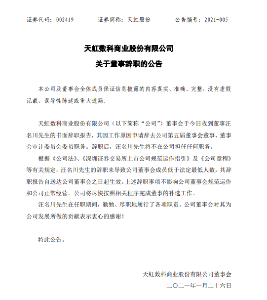 1月26日下午,天虹數(shù)科商業(yè)股份有限公司(以下簡稱“天虹股份”)發(fā)布公告稱,公司董事汪名川辭職。 公告顯示,天虹股份董事會于今日收到董事汪名川先生的書面辭職報告,其因工作原因申請辭去公司第五屆董事會董事、董事會審計委員會委員職務(wù)。辭職后,汪名川先生將不在公司擔(dān)任任何職務(wù)。 根據(jù)《公司法》、《深圳證券交易所上市公司規(guī)范運作指引》及《公司章程》等有關(guān)規(guī)定,汪名川的辭職未導(dǎo)致公司董事會成員低于法定最低人數(shù),其辭職報告自送達(dá)公司董事會之日起生效。上述辭職事項不影響公司董事會規(guī)范運作和公司正常經(jīng)營。天虹股份將盡快按照相關(guān)程序完成董事的補選工作。 天虹股份財報顯示,2020年前三季度,天虹股份實現(xiàn)營收約88.51億元,同比下降37.11%;凈利潤約1.27億元,同比下降80.46%;基本每股收益0.1061元,同比下降80.47%。 2020年前三季度,天虹股份通過發(fā)力線上到家銷售服務(wù),從而營業(yè)收入實現(xiàn)增長,但利潤受到較大影響。主要原因在于疫情初期百貨購物中心業(yè)態(tài)進(jìn)行階段性停業(yè)及縮短營業(yè)時間,疫情常態(tài)階段客流和銷售未達(dá)去年同期水平,同時給予供應(yīng)商大力度的減免租金及管理費的支持。 (來源:聯(lián)商網(wǎng)) |