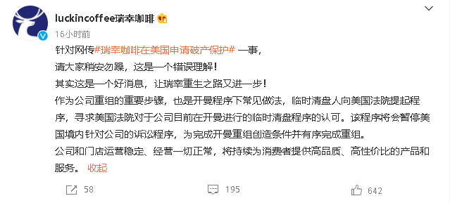 2月5日,瑞幸咖啡(LKNCY.O)在公司官網(wǎng)發(fā)布了公司正申請破產(chǎn)保護的公告。 公告中,瑞幸咖啡表示,公司根據(jù)《破產(chǎn)法》第11篇第15章(Chapter 15 Petition)向美國紐約南區(qū)破產(chǎn)法院提出申請。目前公司正在與其利益相關者就公司財務重組進行談判,通過加強公司的資產(chǎn)負債表,使公司能夠繼續(xù)經(jīng)營,同時為所有利益相關者謀利益。 與此同時,瑞幸咖啡還表示破產(chǎn)申請不會對公司的日常運營產(chǎn)生重大影響,所有門店將保持正常營業(yè),也會繼續(xù)向供應商和員工付款。 2月5日,luckincoffee瑞幸咖啡官方微博回應,針對網(wǎng)傳的公司在美國申請破產(chǎn)保護一事,請大家稍安勿躁,這是一個錯誤理解! 官方稱,其實這是一個好消息,讓瑞幸重生之路又進一步!作為公司重組的重要步驟,也是開曼程序下常見做法,臨時清盤人向美國法院提起程序,尋求美國法院對于公司目前在開曼進行的臨時清盤程序的認可。 官方還強調(diào),該程序?qū)䲡和C绹硟?nèi)針對公司的訴訟程序,為完成開曼重組創(chuàng)造條件并有序完成重組。 此外,瑞幸咖啡還表示,公司和門店運營穩(wěn)定、經(jīng)營一切正常,將持續(xù)為消費者提供高品質(zhì)、高性價比的產(chǎn)品和服務。 |