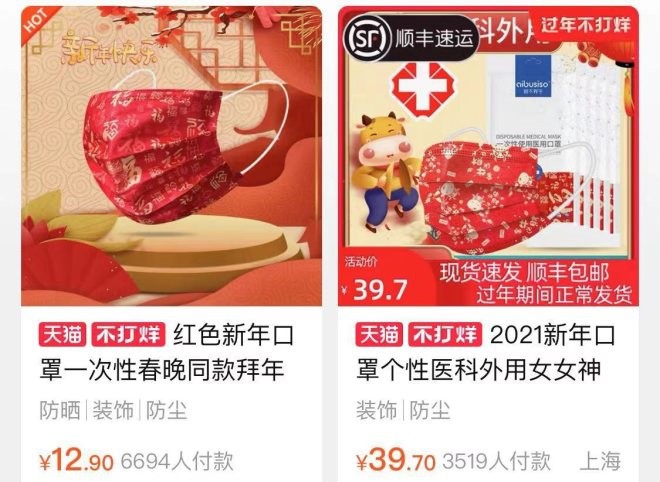 春節(jié)期間,印著“!薄ⅰ敖鹋K拓敗、“卡通!薄ⅰ敖鹪獙殹钡燃閳D案的紅色口罩成了熱銷品。事實上,這些印有吉祥圖案和話語的口罩并非醫(yī)用口罩,主要起到防灰塵、唾液、花粉等作用。 北京市健康教育協(xié)會副會長支修益在接受《北京日報》采訪時表示,這些口罩雖然增加了過年氣氛,但不能替代醫(yī)用口罩使用。 |