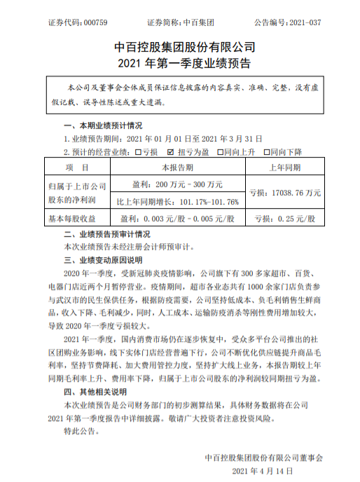 4月13日晚間,中百集團(tuán)(SZ:000759)發(fā)布2021年第一季度業(yè)績預(yù)告。 報(bào)告顯示,2021年第一季度,中百集團(tuán)歸屬上市公司股東的凈利潤預(yù)計(jì)為200 萬元–300 萬元,同比增長101.17%-101.76%;基本每股收益0.003元-0.005元。 對于扭虧為盈的原因,中百集團(tuán)歸因于:2021年一季度,國內(nèi)消費(fèi)市場仍在逐步恢復(fù)中,受眾多平臺公司推出的社區(qū)團(tuán)購業(yè)務(wù)影響,線下實(shí)體門店經(jīng)營普遍下行,中百集團(tuán)不斷優(yōu)化供應(yīng)鏈提升商品毛利率,堅(jiān)持節(jié)費(fèi)降耗、加大費(fèi)用管控力度,堅(jiān)持?jǐn)U大線上業(yè)務(wù),本報(bào)告期較上年同期毛利率上升、費(fèi)用率下降,歸屬于上市公司股東的凈利潤較同期扭虧為盈。 據(jù)悉,2020年第一季度,中百集團(tuán)實(shí)現(xiàn)營業(yè)收入39.54億元,歸屬上市公司股東凈利潤-1.70億元,基本每股收益-0.25元。2020年一季度,受新冠肺炎疫情影響,中百集團(tuán)旗下有 300 多家超市、百貨、電器門店近兩個(gè)月暫停營業(yè)。疫情期間,超市各業(yè)態(tài)共有1000余家門店負(fù)責(zé)參 與武漢市的民生保供任務(wù),根據(jù)防疫需要,中百集團(tuán)堅(jiān)持低成本、負(fù)毛利銷售生鮮商 品,收入下降、毛利減少,同時(shí),人工成本、運(yùn)輸防疫消殺等剛性費(fèi)用增加較大, 導(dǎo)致 2020 年一季度虧損較大。 |