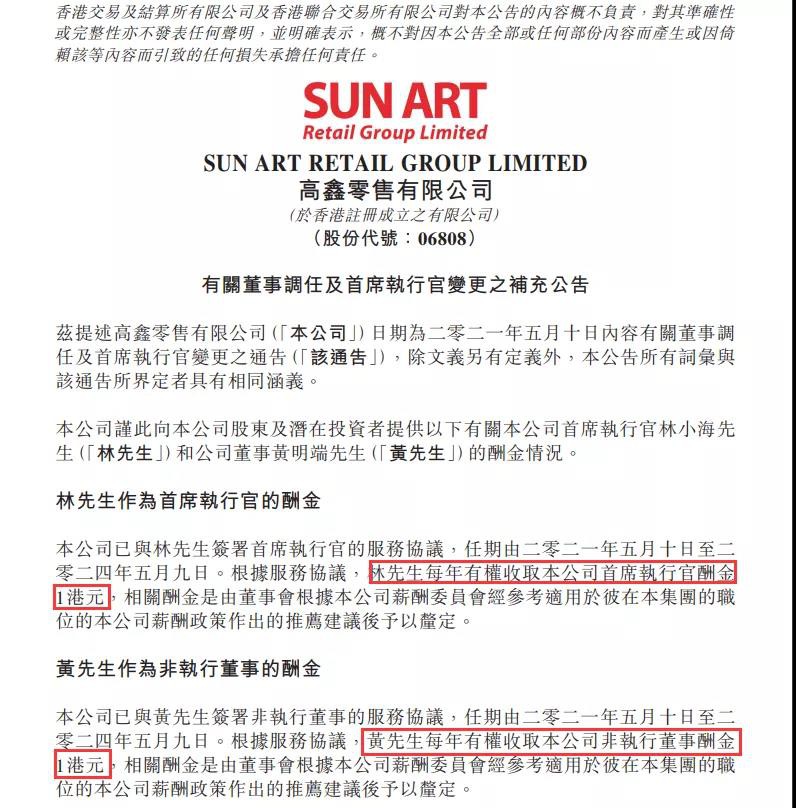 5月23日消息,5月21日,高鑫零售(大潤發(fā))發(fā)布《有關(guān)董事調(diào)任及首席執(zhí)行官變更的補充公告》是關(guān)于首席執(zhí)行官林小海先生及非執(zhí)行董事黃明端先生的酬金情況。 公告稱,林小海先生作為首席執(zhí)行官,高鑫零售已與林小海先生簽署首席執(zhí)行官的服務(wù)協(xié)議,任期由2021年5月10日至2024年5月9日。根據(jù)服務(wù)協(xié)議,林小海先生每年有權(quán)收取高鑫零售首席執(zhí)行官酬金1港元。 黃明端先生作為非執(zhí)行董事,高鑫零售已與黃明端先生簽署非執(zhí)行董事的服務(wù)協(xié)議,任期由2021年5月10日至2024年5月9日。根據(jù)服務(wù)協(xié)議,黃明端先生每年有權(quán)收取高鑫零售非執(zhí)行董事酬金1港元。 此前報道,5月10日,大潤發(fā)母公司高鑫零售有限公司(以下簡稱高鑫零售)發(fā)布首席執(zhí)行官變更及董事調(diào)任公告:66歲的黃明端屆齡退休,辭任公司首席執(zhí)行官,繼續(xù)擔(dān)任董事會主席。林小海獲委任為高鑫零售CEO。 截至2021年3月31日止15個月實現(xiàn)收入約人民幣1243.34億元,同比減少2.01%;其中一季度營收入288.48億元,同比下降8.49%,凈利7億元,同比下降49.6%。 截至2021年3月31日高鑫零售新開10家大賣場,3家中型超市及32家小型超市,還關(guān)閉了三家華東門店。 截至2021年3月31日,高鑫零售在華共有490家大賣場及6家中型超市,總建筑面積約為1,321萬平方米,其中約70.4%為租賃門店及29.6%為自有物業(yè)門店。 |