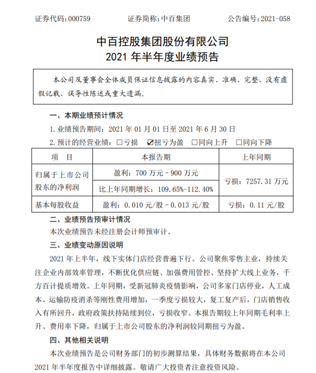 7月12日晚間,中百集團(tuán)發(fā)布2021年半年度業(yè)績預(yù)告。 中百集團(tuán)預(yù)計,2021年上半年實現(xiàn)歸屬上市公司股東的凈利潤可達(dá)700萬-900萬元,同比增長109.65%-112.40%。去年同期,中百集團(tuán)實現(xiàn)虧損7257.31萬元。 關(guān)于業(yè)績變動的原因,中百集團(tuán)在公告中表示,2021年上半年,線下實體門店經(jīng)營普遍下行。中百集團(tuán)聚焦零售主業(yè),持續(xù)關(guān)注企業(yè)內(nèi)部效率管理,不斷優(yōu)化供應(yīng)鏈、加強(qiáng)費(fèi)用管控、堅持?jǐn)U大線上業(yè)務(wù),千方百計提質(zhì)增效。 上年同期,受新冠肺炎疫情影響,中百集團(tuán)多家門店停業(yè),人工成本、運(yùn)輸防疫消殺等剛性費(fèi)用增加,一季度虧損較大,復(fù)工復(fù)產(chǎn)后,門店銷售收入有所回升,政府政策扶持陸續(xù)到位,虧損收窄。本報告期較上年同期毛利率上升、費(fèi)用率下降,歸屬于上市公司股東的凈利潤較同期扭虧為盈。 |