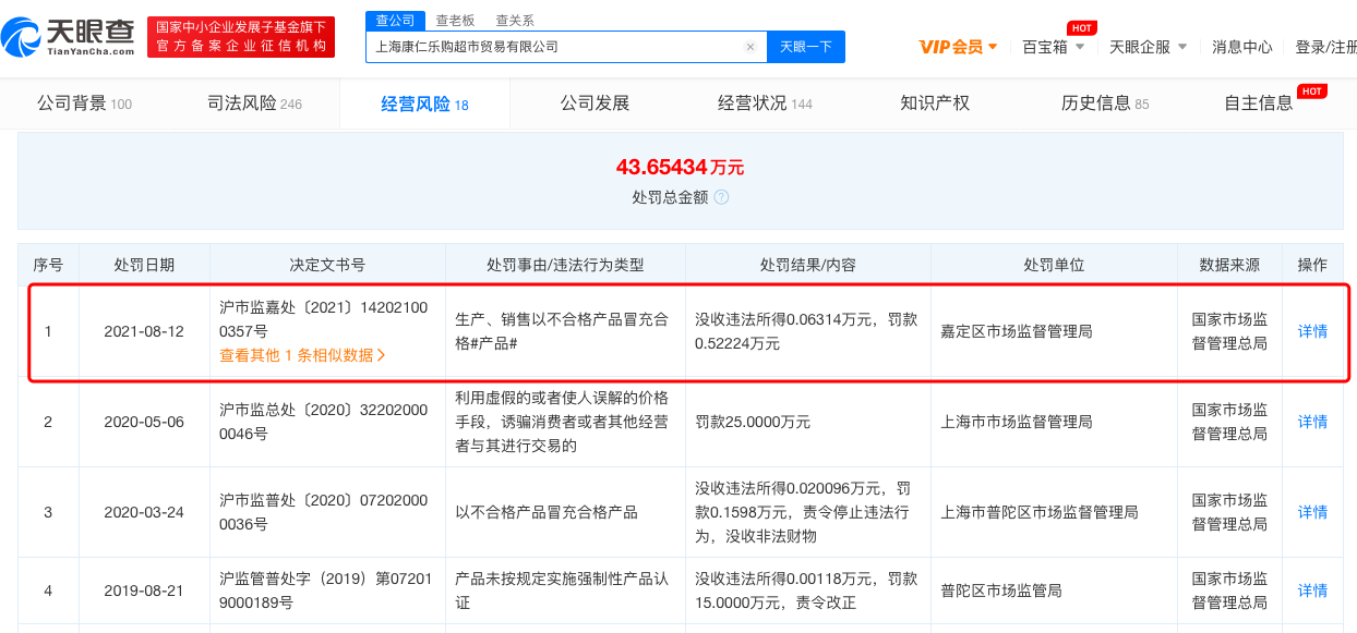 天眼查APP顯示,近日,上?等蕵(lè)購(gòu)超市貿(mào)易有限公司因生產(chǎn)、銷售以不合格產(chǎn)品冒充合格產(chǎn)品被罰約5200元,處罰單位為嘉定區(qū)市場(chǎng)監(jiān)督管理局。此前該公司已多次因產(chǎn)品問(wèn)題被處罰。 在去年5月份,樂(lè)購(gòu)超市就因利用虛假或使人誤解的價(jià)值手段,誘導(dǎo)消費(fèi)者或者其他經(jīng)營(yíng)者與其進(jìn)行交易的問(wèn)題被上海市市場(chǎng)監(jiān)管局處罰25萬(wàn)元人民幣。 |