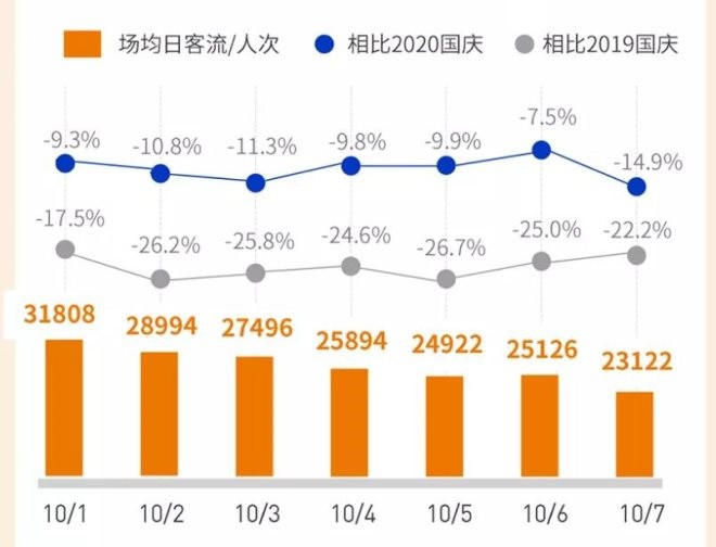 據(jù)匯納科技旗下匯客云數(shù)據(jù)平臺(tái)監(jiān)測的數(shù)據(jù)顯示,2021年國慶長假期間,全國購物中心總客流7.86億人次;場均日客流26766人次,相比2020年國慶下降8%,相比2019年國慶下降24%。 單日上看,從10月1日至7日?qǐng)鼍湛土鞒手鹑者f減的趨勢,10月1日當(dāng)日最高值超3萬人次。 從區(qū)域分布上看,七大區(qū)域場均日客流均達(dá)到了2.5萬人次以上的水平,且華東、華中、華南三區(qū)最高。 從城市層級(jí)分布情況上看,一線城場均日客流最高至2.8萬人次,緊隨其后的是三線及以下城市也接近2.8萬人次。 另據(jù)中華全國商業(yè)信息中心消息,根據(jù)統(tǒng)計(jì),2021年10月1日至7日,全國百家重點(diǎn)大型零售企業(yè)(以百貨商場為主)零售額相比上年同期同比下降9.2%,相比2019年同期同比下降0.1%。 |