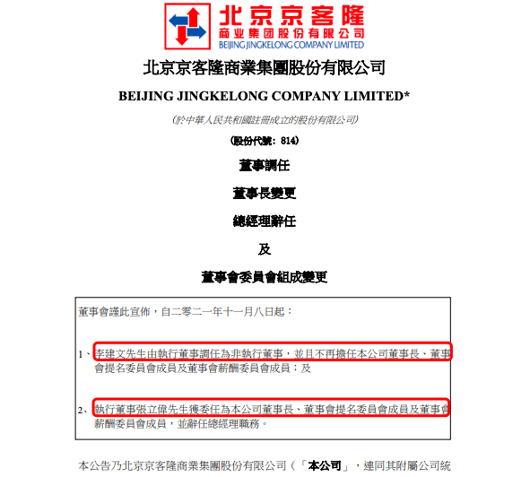 11月8日,北京京客隆發(fā)布董事長(zhǎng)變更、總經(jīng)理辭任及董事會(huì)委員會(huì)組成變更公告。 公告宣布,李建文由執(zhí)行董事調(diào)任為非執(zhí)行董事,并且不再擔(dān)任董事長(zhǎng)、董事會(huì)提名委員會(huì)成員及董事會(huì)薪酬委員會(huì)成員。執(zhí)行董事張立偉獲委任為北京京客隆董事長(zhǎng)、董事會(huì)提名委員會(huì)成員及董事會(huì)薪酬委員會(huì)成員,并辭任總經(jīng)理職務(wù)。 今年前三季度財(cái)報(bào)顯示,北京京客隆營(yíng)業(yè)收入為84.87億元,同比下跌6.18%;歸屬于母公司所有者的凈利潤(rùn)虧損403萬(wàn)元,上一年同期為盈利5378萬(wàn)元。 |