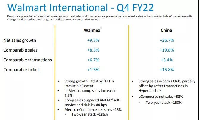 2月18日,沃爾瑪2022財年第四季度財報發(fā)布,沃爾瑪Q4總營收為1529億美元,同比增長0.5%;Q4營業(yè)利潤為59億美元,同比增長5.9%。 沃爾瑪中國Q4凈銷售額增長26.7%,可比銷售額增長19.8%;其中,山姆會員商店和電商業(yè)務表現(xiàn)出色,沃爾瑪中國Q4電商凈銷售額增長93%,兩年疊加增長率為158%。 |