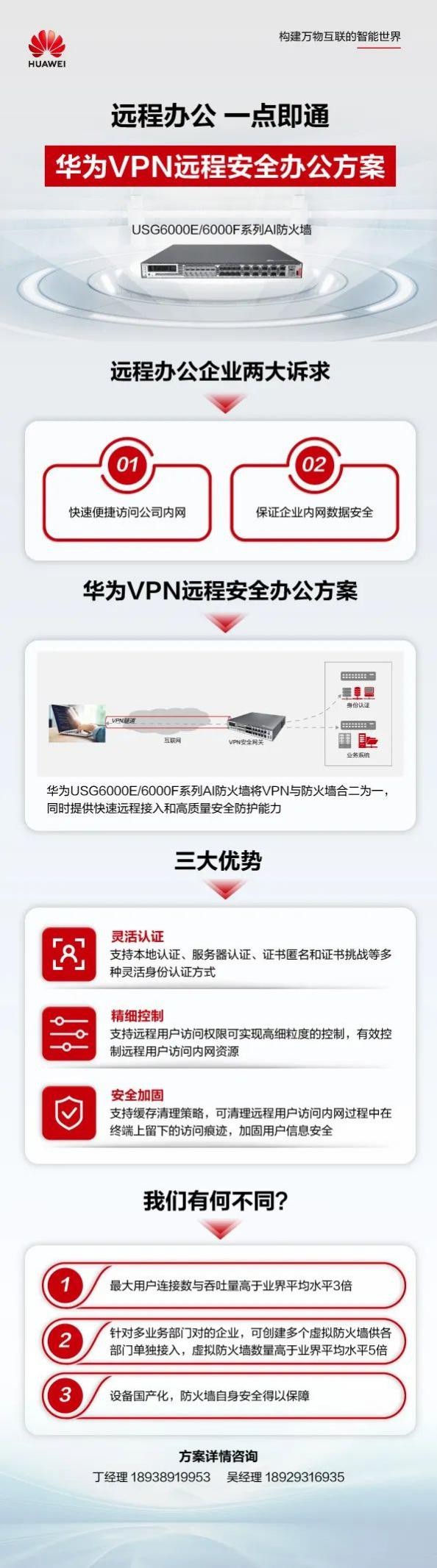 接下來為大家介紹一種 保障企業(yè)網(wǎng)絡及信息安全的方式 華為VPN遠程安全辦公方案 華為VPN遠程安全辦公方案,防火墻和VPN網(wǎng)關火墻二合一,提供快速遠程接入+高質量安全防護能力,如同從家中開通一個專用隧道,員工在進入前可進行電腦體檢。同時,華為VPN遠程安全辦公方案支持各類電腦和手機。如果公司原來用的華為防火墻,居家辦公無需購買其他設備,直接開通SSL VPN license即可快速連接。 不見面,我們依然高度默契 不說話,我們也能密切聯(lián)系 值此特殊時期 讓我們以數(shù)字化轉型力量 一起筑牢安全防線 以實際行動踐行責任 期待春暖花開 |