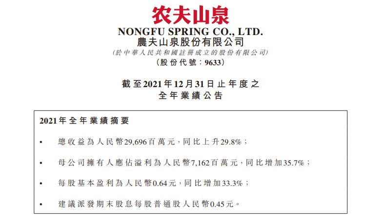 3月28日,農(nóng)夫山泉發(fā)布2021年度業(yè)績報告。報告期內(nèi),農(nóng)夫山泉實現(xiàn)營收296.96億元,同比增長29.8%;實現(xiàn)凈利71.62億元,同比增長35.7%;實現(xiàn)毛利176.56億元,同比增加30.7%。 毛利率上,2021年農(nóng)夫山泉的毛利率為59.46%,與2020年的59.05%基本持平,依舊高于行業(yè)平均水平。此外,農(nóng)夫山泉2021年的經(jīng)營活動現(xiàn)金流同比2020年增加35.2%至114億元。 去年賣得最多還是水 2021年中國飲料制造業(yè)營業(yè)收入同比增長13.5%,其中,(罐)裝飲用水制造業(yè)同比增長12%,茶飲料及其他軟飲料制造業(yè)同比增12%,果菜汁及果菜汁飲料制造業(yè)同比增長近14%,碳酸飲料制造業(yè)同比增長19%,含乳飲料和植物蛋白飲料制造業(yè)同比增長近11%,固體飲料制造業(yè)同比增長近15%。 具體來看,包裝水、茶飲料、功能飲料、果汁飲料等品類均出現(xiàn)了較大幅度的收入增長的情況。包裝飲用水產(chǎn)品的收益為170.58億元,同比增長22.1%,占總收益的比例為57.4%;茶飲料產(chǎn)品的收益為45.79億元,同比增長48.3%,占總收益的15.4%;功能飲料產(chǎn)品的收益為36.95億元,同比增長32.3%,占總收益的12.4%;果汁飲料產(chǎn)品的收益為26.14億元,同比增長32.2%,占總收益的8.8%。 此外,包括蘇打水飲料、含氣風(fēng)味飲料、咖啡飲料、植物酸奶產(chǎn)品等其他飲料,及鮮果等農(nóng)產(chǎn)品在內(nèi)的其他產(chǎn)品的2021年營收為人民幣17.5億元,較2020年增長66.0%,占全年總營收的6.0%。 涵蓋四大品類 2021農(nóng)夫山泉推十余款新品 農(nóng)夫山泉始終力主創(chuàng)新,尋求突破,持續(xù)研發(fā)更貼近消費者需求的產(chǎn)品。2021年,推出了覆蓋四大品類的十余款創(chuàng)新產(chǎn)品。 報告期內(nèi),農(nóng)夫山泉相繼推出了源自新水源地福建武夷山的農(nóng)夫山泉泡茶武夷山泉水和源自吉林長白山原始森林自涌泉群的農(nóng)夫山泉長白雪天然雪山礦泉水新品,進(jìn)一步豐富了飲用水產(chǎn)品線。 2021年是東方樹葉茶飲料上市十周年,上半年,推出青柑普洱和玄米茶兩款新口味,中秋節(jié)期間,進(jìn)一步推出首款季節(jié)限定產(chǎn)品桂花烏龍,通過對茶文化和茶產(chǎn)品的探索、研究和創(chuàng)新,讓更多人愛上東方樹葉。 2021年9月,推出煥新打奶茶。打奶茶憑藉高品質(zhì)的原料、先進(jìn)的工藝和低糖配方,為消費者帶來全新的高品質(zhì)奶茶新體驗,一經(jīng)上市即受到眾多消費者的稱贊和歡迎。 2021年,尖叫飲料推出中國首款主打等滲概念的等滲系列新品,該產(chǎn)品專為運動科學(xué)補水而設(shè)計,此次推出的兩款新品分別為海鹽柚子味(含糖)和海鹽青橘味(無糖),分別適合中高強度運動人群和輕運動、有氧運動人群。 已擁有18年歷史的農(nóng)夫果園果汁品牌,通過大包裝雙聯(lián)喜宴裝,結(jié)合節(jié)慶場景進(jìn)行主題推廣,助力旺季銷售,繼續(xù)實現(xiàn)品牌提升和增長。水溶C100飲料則在2021年推出西柚汁口味時尚口袋裝,滿足年輕消費者的個性化和便攜化需求,拓寬消費場景。 值得一提的是,3月28日,農(nóng)夫山泉報收38.05港元/股,微跌0.52%,總市值4279.28億港元(約合人民幣3481.19億元),相較2021年1月8日創(chuàng)下的最高點68.40港元/股,已經(jīng)跌去超過4成,市值蒸發(fā)約3500億港元(約合人民幣2847.25億元)。 而3月17日發(fā)布的《胡潤全球富豪榜》則顯示,現(xiàn)年68歲的鐘睒睒財富雖然較去年縮水近1000億元,但仍以4550億元的身家蟬聯(lián)中國首富。 |