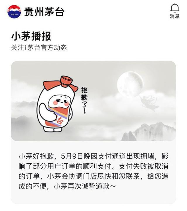 5月10日,貴州茅臺(tái)電商平臺(tái)“i茅臺(tái)”通過其官方App發(fā)布致歉公告:5月9日晚因支付通道出現(xiàn)擁堵,影響了部分用戶訂單的順利支付。支付失敗被取消的訂單,小茅會(huì)協(xié)調(diào)門店盡快和您聯(lián)系,給您造成的不便,小茅再次誠(chéng)摯道歉。 |