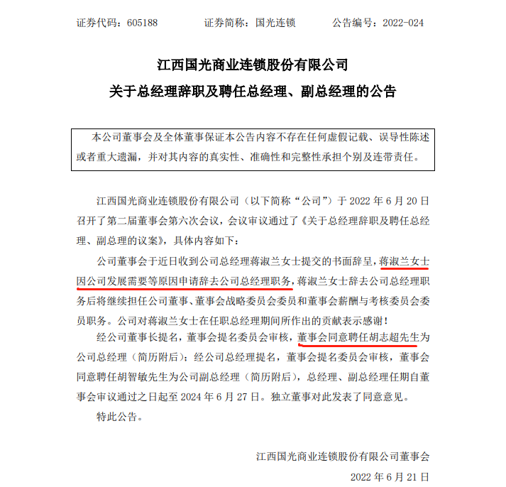 6月20日,江西國(guó)光商業(yè)連鎖股份有限公司發(fā)布關(guān)于總經(jīng)理辭職及聘任總經(jīng)理、副總經(jīng)理的公告稱,總經(jīng)理蔣淑蘭因公司發(fā)展需要等原因申請(qǐng)辭去公司總經(jīng)理職務(wù),辭去公司總經(jīng)理職務(wù)后將繼續(xù)擔(dān)任公司董事、董事會(huì)戰(zhàn)略委員會(huì)委員和董事會(huì)薪酬與考核委員會(huì)委員職務(wù)。 同時(shí),聘任胡志超為公司總經(jīng)理,胡智敏為公司副總經(jīng)理?偨(jīng)理、副總經(jīng)理任期自董事會(huì)審議通過(guò)之日起至2024年6月27日。 值得注意的是,國(guó)光連鎖今年第一季度財(cái)報(bào)顯示,公司實(shí)現(xiàn)營(yíng)業(yè)總收入6.16億元,同比增長(zhǎng)3.12%;歸母凈利潤(rùn)1578.38萬(wàn)元,同比下降47.11%;扣非凈利潤(rùn)1341.64萬(wàn)元,同比下降34.78%。 |