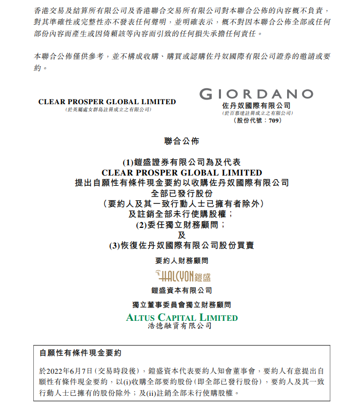 6月23日,佐丹奴發(fā)布公告,香港鄭家純家族旗下公司周大?毓赏高^鎧盛資本提出收購要約,其中包含注銷未行使購股權(quán)的要求。具體要約提出人為周大福全資子公司 Clear Prosper。 周大福將以每股1.88港元的價格進(jìn)行收購,較佐丹奴停牌前的每股1.59港元溢價約18.2%。此次全購要約最高涉及金額達(dá)到25.6億港元(約合21.82億元人民幣)。 佐丹奴成立于1981年,除同名主品牌外,佐丹奴旗下還有 BSX、Junior 和 Giord Ladies 等子品牌。1991 年佐丹奴正式在港交所上市,次年進(jìn)入中國內(nèi)地市場。 據(jù)了解,中國仍是全球佐丹奴最大的市場,但可投放市場295%至7.01億,香港地區(qū)則下降53.1%。2021 年12月31日12月31日,佐丹奴內(nèi)范圍內(nèi)共有2185家,較2020年190年減少家,員工總數(shù)減少1500人。 周大福(HK01929,股價13.74港元,市值1374億港元)是國內(nèi)市占率排名第一的黃金珠寶零售商。據(jù)2022財年年報顯示,營業(yè)額逼近千億港元(989.38億港元),同比大增41%;公司股東應(yīng)占溢利達(dá)到67.12億港元,同比增長11.4%。截至2022年3月31日,周大福零售網(wǎng)絡(luò)擴大至5902個零售點,于本財年凈增加1311個零售點。 但是,周大福同期近日也了2022年4月1日至5月31日的相關(guān)數(shù)據(jù),但這兩月業(yè)績并不理想。期間,整體零售額同比下降13%,中國內(nèi)地同比下降12.8%,中國香港、中國澳門及其他市場同比下降14.2%。此外,中國內(nèi)地、中國香港及中國澳門的同店銷售額、同店銷量也均呈下降趨勢。 |