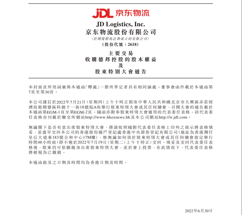 6月30日消息,今日,京東物流股份有限公司發(fā)布公告稱,公司謹(jǐn)訂于2022年7月21日(星期四)召開(kāi)“京東物流收購(gòu)德邦股份的決議案”股東特別大會(huì),股東大會(huì)通過(guò)決議后,將正式進(jìn)入交割,德邦股份才能進(jìn)入“京東物流”時(shí)間,然后開(kāi)啟德邦股份新的“董事會(huì)”結(jié)構(gòu)。 據(jù)了解,今年3月11日,京東物流與德邦物流達(dá)成戰(zhàn)略合作,京東物流將收購(gòu)德邦股份66.49%股份,并在快遞快運(yùn)、跨境、倉(cāng)儲(chǔ)與供應(yīng)鏈等領(lǐng)域展開(kāi)深度合作。有消息透露,合作后雙方將繼續(xù)保持品牌和團(tuán)隊(duì)獨(dú)立運(yùn)營(yíng),戰(zhàn)略和業(yè)務(wù)方向整體保持不變。 另外,德邦股份于同日發(fā)布公告稱,京東卓風(fēng)合計(jì)將受讓公司99.987%股份,同時(shí),公司向上海證券交易所申請(qǐng),公司股票將于2022年3月14日上午開(kāi)市起復(fù)牌。 |
