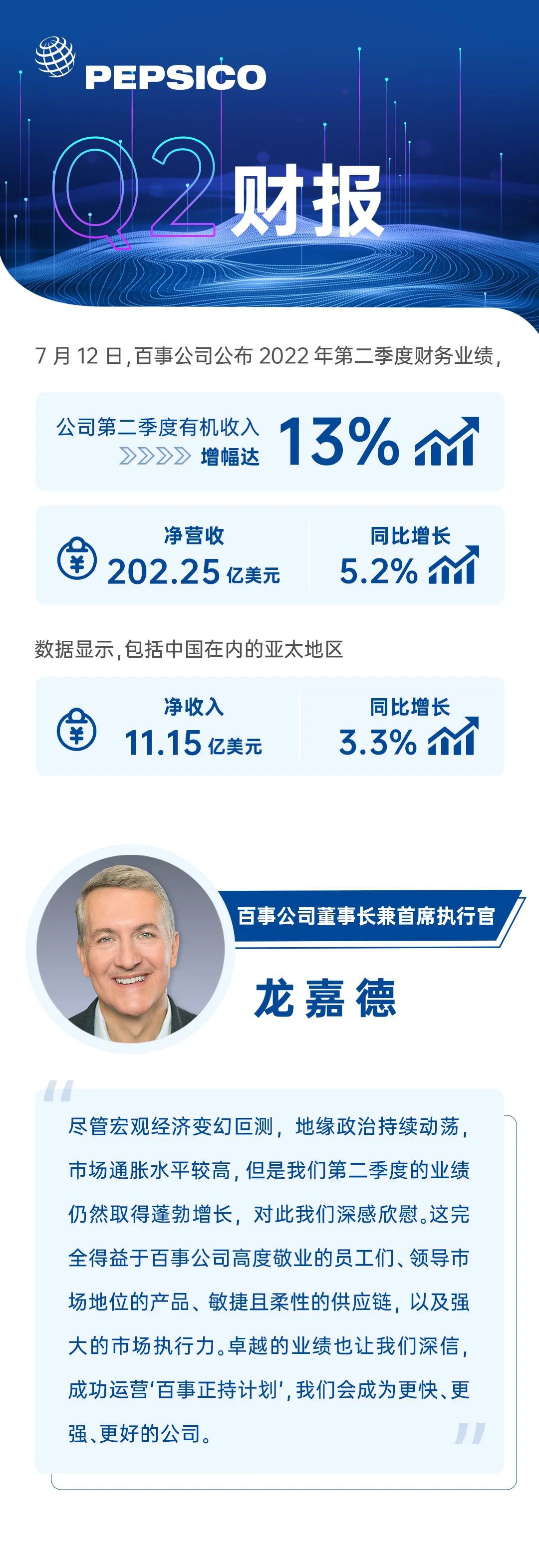 2021年7月13日,百事公司公布了截至2021年6月12日的第二季度財(cái)務(wù)業(yè)績。數(shù)據(jù)顯示,公司Q2凈營收192.17億美元,上年同期為159.45億美元,同比增長20.5%;歸屬于公司的凈利潤23.58億美元,上年同期為16.46億美元,同比增長43.26%。 百事公司董事長兼首席執(zhí)行官龍嘉德預(yù)計(jì)稱,2021財(cái)年全年有機(jī)營收增長將達(dá)6%,核心每股收益將增長11%。 |