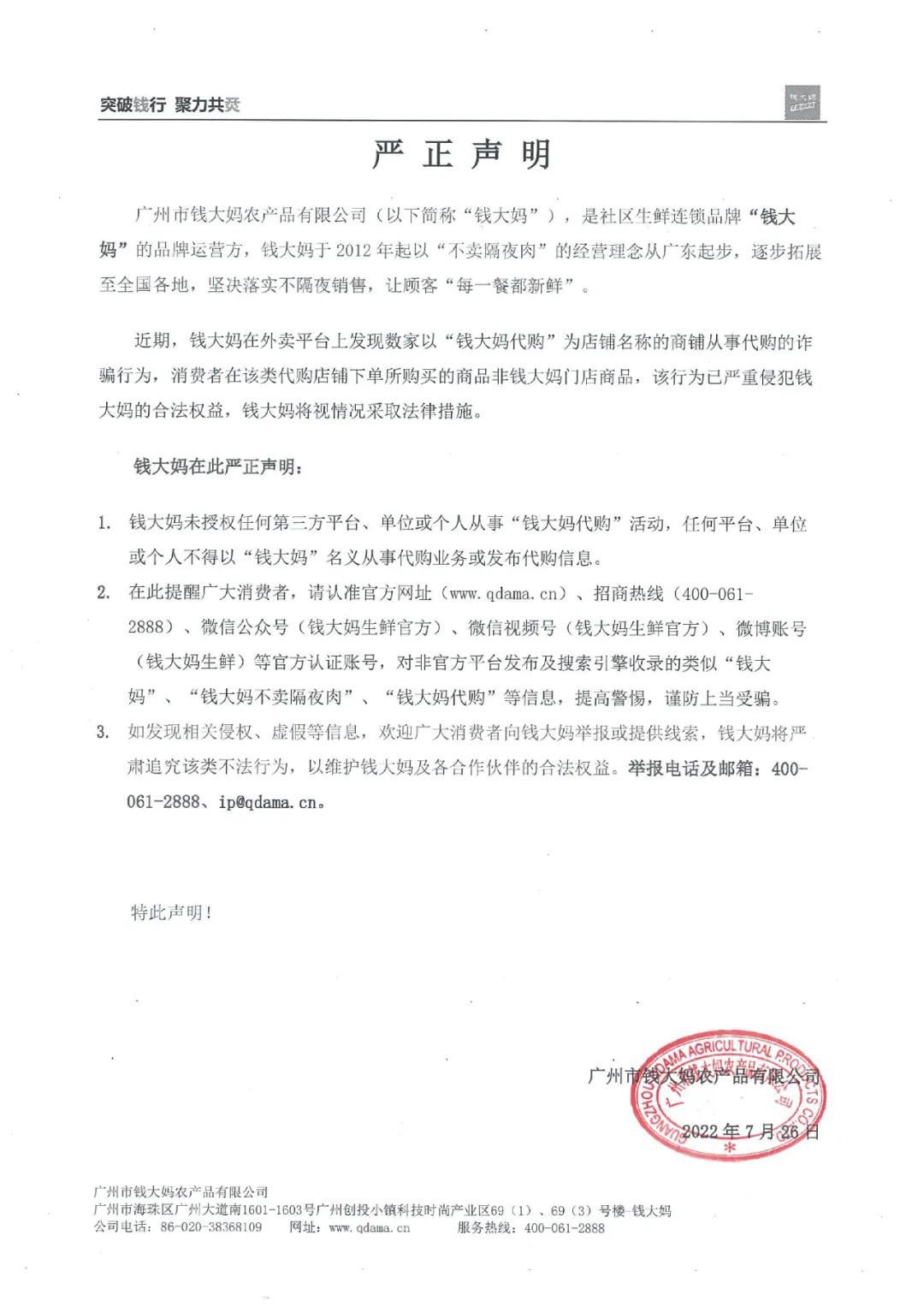 7月26日晚,錢大媽生鮮官微聲明稱,在外賣平臺上發(fā)現(xiàn)數(shù)家以“錢大媽代購”為店鋪名稱的商鋪從事代購的詐騙行為。未授權任何第三方平臺、單位或個人從事“錢大媽代購”活動。 聲明如下: 廣州市錢大媽農產品有限公司(以下簡稱“錢大媽”),是社區(qū)生鮮連鎖品牌“錢大媽”的品牌運營方,錢大媽于2012年起以“不賣隔夜肉”的經營理念從廣東起步,逐步拓展至全國各地,堅決落實不隔夜銷售,讓顧客每一餐都新鮮。 近期,錢大媽在外賣平臺上發(fā)現(xiàn)數(shù)家以“錢大媽代購”為店鋪名稱的商鋪從事代購的詐騙行為,消費者在該類代購店鋪下單所購買的商品非錢大媽門店商品,該行為已嚴重侵犯錢大媽的合法權益,錢大媽將視情況采取法律措施。 錢大媽在此嚴正聲明: 1.錢大媽未授權任何第三方平臺、單位或個人從事“錢大媽代購”活動,任何平臺、單位或個人不得以“錢大媽”名義從事代購業(yè)務或發(fā)布代購信息。 2.在此提醒廣大消費者,請認準官方網址(www.qdama.cn)、招商熱線(400-061-2888)、微信公眾號(錢大媽生鮮官方)、微信視頻號(錢大媽生鮮官方)、微博賬號(錢大媽生鮮)等官方認證賬號,對非官方平臺發(fā)布及搜索引擎收錄的類似“錢大媽”、“錢大媽不賣隔夜肉”、“錢大媽代購”等信息,提高警惕,謹防上當受騙。 3.如發(fā)現(xiàn)相關侵權、虛假等信息,歡迎廣大消費者向錢大媽舉報或提供線索,錢大媽將嚴肅追究該類不法行為,以維護錢大媽及各合作伙伴的合法權益。舉報電話及郵箱:400-061-2888、ip@qdama.cn。 特此聲明! 廣州市錢大媽農產品有限公司 2022年7月26日 |