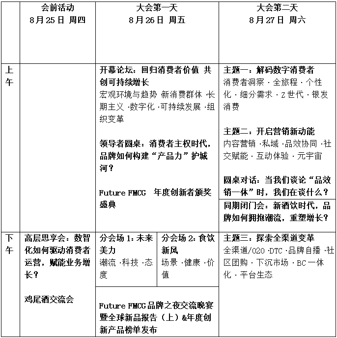 2022第三屆亞洲快消品行業(yè)創(chuàng)新峰會(huì)暨Future FMCG創(chuàng)新節(jié)(Future FMCG 2022)由決策者零售研究院和決策者智庫主辦,廣東省日化商會(huì)、廣東省首席信息官協(xié)會(huì)作為協(xié)辦單位,波士頓咨詢公司提供智力支持,將于8月25-27日在廣州隆重召開。 Future FMCG年度創(chuàng)新產(chǎn)品TOP榜單作為Future FMCG創(chuàng)新節(jié)的最大亮點(diǎn),由決策者零售研究院發(fā)起,天貓新品創(chuàng)新中心(TMIC)作為智力支持,旨在發(fā)現(xiàn)過去一年里在快消品領(lǐng)域有著卓越表現(xiàn)和創(chuàng)新動(dòng)力的企業(yè),評(píng)選表彰真正以消費(fèi)者為中心,兼具硬核實(shí)力和人文關(guān)懷的創(chuàng)新產(chǎn)品案例,為行業(yè)發(fā)展樹立新的標(biāo)桿,激發(fā)產(chǎn)業(yè)創(chuàng)新潛能,打造一個(gè)創(chuàng)新者們專屬的展示與交流平臺(tái)。 產(chǎn)品創(chuàng)新是品牌成功的根本。Future FMCG年度創(chuàng)新產(chǎn)品榜單旨在表彰基于當(dāng)前消費(fèi)升級(jí)、消費(fèi)市場分層化的結(jié)構(gòu)性變化,改變傳統(tǒng)思維或應(yīng)用新興科技,對(duì)產(chǎn)品的功能、設(shè)計(jì)、審美、場景等方面進(jìn)行創(chuàng)新和變革,從而滿足消費(fèi)者的品質(zhì)化、個(gè)性化、健康化或體驗(yàn)化需求的優(yōu)秀品牌及其案例。 Future FMCG 年度創(chuàng)新產(chǎn)品榜單分為未來美力TOP 20、食飲新風(fēng)TOP 20以及母嬰生活TOP 20等三個(gè)子榜單。截至6月10日,決策者零售研究院征集到400+產(chǎn)品案例,經(jīng)過初審篩選,共有139個(gè)“食飲新風(fēng)”產(chǎn)品案例,87個(gè)“未來美力”產(chǎn)品案例,以及81個(gè)“母嬰生活”產(chǎn)品案例,總計(jì)307個(gè)產(chǎn)品案例進(jìn)入年度創(chuàng)新產(chǎn)品榜單最終角逐。經(jīng)過兩周激烈的專家評(píng)審和網(wǎng)絡(luò)投票環(huán)節(jié),最終評(píng)選出TOP 20創(chuàng)新產(chǎn)品案例。我們希望未來涌現(xiàn)出更多積極探索、創(chuàng)新思維的前行者,真正以消費(fèi)者價(jià)值為核心,個(gè)性化需求為宗旨,在強(qiáng)競爭的新消費(fèi)時(shí)代堅(jiān)守初心,實(shí)現(xiàn)突破。再次感謝各品牌、TMIC、協(xié)會(huì)、媒體等業(yè)內(nèi)同行的支持! 食飲新風(fēng)TOP 20年度創(chuàng)新產(chǎn)品榜單(排序不分先后) 未來美力TOP 20年度創(chuàng)新產(chǎn)品榜單(排序不分先后) 母嬰生活TOP 20年度創(chuàng)新產(chǎn)品榜單(排序不分先后) 2022第三屆亞洲快消品行業(yè)創(chuàng)新峰會(huì)暨Future FMCG創(chuàng)新節(jié)由CDMC決策者智庫和CRRI決策者零售研究院主辦,廣東省日化商會(huì)、廣東省首席信息官協(xié)會(huì)作為協(xié)辦單位,BCG波士頓咨詢公司提供智力支持,將于8月25-27日在廣州召開。 活動(dòng)主題為“回歸消費(fèi)者價(jià)值 共創(chuàng)可持續(xù)增長”,聚焦中國乃在亞洲快消行業(yè)發(fā)展動(dòng)態(tài)與最新趨勢,匯集大快消領(lǐng)域(食品飲料、美妝個(gè)護(hù)、日化家清、酒水)行業(yè)專家、精英領(lǐng)袖以及新興力量共同暢談前瞻觀點(diǎn),探索行業(yè)洞察與趨勢、品牌增長、消費(fèi)者運(yùn)營、營銷創(chuàng)新、全渠道融合、數(shù)字化變革等核心議題,助力品牌企業(yè)深入行業(yè)洞察、突破增長瓶頸,并推動(dòng)市場業(yè)態(tài)的健康循環(huán)和繁榮向前。 以下為此次活動(dòng)已經(jīng)確認(rèn)的發(fā)言嘉賓,我們也期待貴司的參與! 薛薇,東北亞董事總經(jīng)理,拜爾斯道夫 董明,大中華區(qū)供應(yīng)鏈及采購高級(jí)副總裁,雀巢 張煒,總裁助理、數(shù)字化轉(zhuǎn)型辦公室主任,立白集團(tuán) 寶潔 名創(chuàng)優(yōu)品 Philia Li,亞太區(qū)洞察及分析高級(jí)總監(jiān),百事 待定,蒙牛 常青濤,副總裁,威萊集團(tuán) 劉明,副總裁,上美集團(tuán) 姚靖,CIO,嘉士伯中國 張君玲,數(shù)字運(yùn)營中心副總經(jīng)理,丹姿集團(tuán) 尹娜,新業(yè)務(wù)事業(yè)部負(fù)責(zé)人,惠氏營養(yǎng)品中國 羅軼群,CIO,良品鋪?zhàn)?/div> 蔡慧中,數(shù)字化營銷負(fù)責(zé)人,嘉士伯中國 虞堅(jiān),大中華區(qū)總經(jīng)理,凱度消費(fèi)者指數(shù) 胡懿,CMO,CHALI茶里 媒介總監(jiān),妙可藍(lán)多 強(qiáng)小明,創(chuàng)始人,鯊魚菲特 丁佳川,董事總經(jīng)理&全球合伙人,波士頓咨詢公司 劉嘉寧,華南區(qū)負(fù)責(zé)人,尼爾森IQ 陳牧凡,南區(qū)執(zhí)行總監(jiān),凱度消費(fèi)者指數(shù) 太古可口可樂 屈臣氏 華潤雪花啤酒 林清軒 保樂力加 聯(lián)合利華 阿道夫 已確認(rèn)參會(huì)企業(yè): 伊利、上美集團(tuán)、惠氏營養(yǎng)品、立白、良品鋪?zhàn)、丹姿集團(tuán)、保樂力加、阿道夫、袋鼠媽媽、肯德基、泰山啤酒、可啦啦、瀘州老窖、郎酒、洋河、今世緣、王老吉、蒙牛、妙可藍(lán)多、冷酸靈、上海和黃白貓、嘉士伯、名創(chuàng)優(yōu)品、GSK、舒客、高金食品、欖菊、讓茶、曼秀雷敦、藍(lán)月亮、廣東佳寶集團(tuán)、水之蔻、美麗健食品、獅王、億滋、小刀酒、無限極、江小白、拜爾斯道夫、百事、華潤雪花、茶里、鯊魚菲特、凱度、舒客、金光集團(tuán)、河北華素素食品股份有限公司、燕之坊、每日黑巧、生和堂、迪彩、同仁堂、健合集團(tuán)、凱美斯、廣