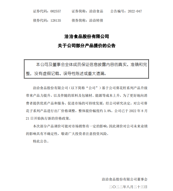 8月23日,洽洽食品發(fā)布公告稱,基于公司葵花籽系列產(chǎn)品升級帶來產(chǎn)品力提升,以及伴隨的原料及包輔材、能源等成本上升,為了更好地向消費(fèi)者提供優(yōu)質(zhì)產(chǎn)品和服務(wù),促進(jìn)市場的可持續(xù)發(fā)展,經(jīng)公司研究決定,對公司葵花子系列產(chǎn)品進(jìn)行出廠價(jià)格調(diào)整,整體提價(jià)幅度約3.8%。公司已于2022年8月21日開始執(zhí)行新的價(jià)格政策。 本次部分產(chǎn)品調(diào)價(jià)可能對市場銷售有一定的影響,因此調(diào)價(jià)對公司未來業(yè)績的影響具有不確定性,提示廣大投資者注意投資風(fēng)險(xiǎn)。 值得注意的是,去年10月,洽洽食品基于瓜子系列產(chǎn)品升級及原材料成本上升,宣布對旗下葵花籽系列產(chǎn)品以及南瓜子、小而香西瓜子產(chǎn)品進(jìn)行出廠價(jià)格調(diào)整,各品類提價(jià)幅度為8%-18%不等,價(jià)格執(zhí)行于2021年10月22日開始實(shí)施。 針對上述舉措,公司表示,總體來看,瓜子去年調(diào)價(jià)完成,傳導(dǎo)比較順利,今年一季度瓜子板塊毛利率略有提升;不過,由于原料、包輔材價(jià)格也在同步提升,上半年葵花子整體毛利率同比仍有所下行。 |
