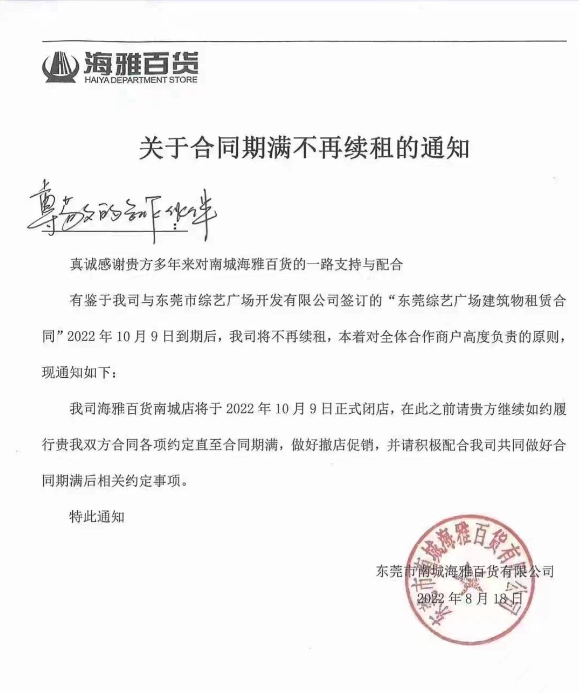 8月18日,海雅百貨南城店發(fā)布公告稱將于2022年10月9日租約到期后正式閉店歇業(yè)。該店閉店后,海雅百貨在東莞僅剩下海雅百貨東城店。 公告顯示,鑒于公司與東莞市綜藝廣場開發(fā)有限公司簽訂的“東莞綜藝廣場建筑租賃合同”2022年10月9日到期后不再續(xù)約,將關(guān)閉海雅百貨南城店,商戶做好撤店事宜。 據(jù)悉,海雅百貨南城店位于東莞市南城區(qū)莞太路交匯處的曼哈頓綜藝廣場中心,占有1~6層的全部裙樓商業(yè)部分以及車位,總面積達(dá)到3.5萬平方米。項(xiàng)目于2008年5月開業(yè),開業(yè)后10年一直是區(qū)域內(nèi)很受歡迎的商場之一。 而其所處的鴻福路商圈也是2010年之后南城最火熱的商圈,彼時(shí)聚集了萊蒙、凱德、海雅、國美、蘇寧、時(shí)尚電器、沃爾瑪、家樂福等多個(gè)商超點(diǎn)。但隨著大型城市綜合體民盈國貿(mào)城開業(yè)、老牌購物中心匯一城升級(jí),以及其他特色商業(yè)開業(yè),老牌百貨商超受到?jīng)_擊日漸式微,被市場淘汰。據(jù)悉,海雅百貨閉店前,位于該區(qū)域的家樂福超市也在2020年8月閉店。 |