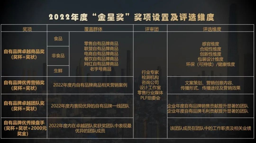2022 年 9 月 27 日下午,全球自有品牌產(chǎn)品亞洲展第六屆PLF自有品牌金星獎(jiǎng)在上海順利舉辦。抵達(dá)現(xiàn)場(chǎng)的評(píng)審和參賽代表有: 上海市商務(wù)委員會(huì)四級(jí)調(diào)研員 胡清頎先生 上海商學(xué)院工商管理學(xué)院市場(chǎng)營(yíng)銷系 周勇教授 上海市自有品牌協(xié)會(huì)會(huì)長(zhǎng) 姚錚女士 上海市自有品牌協(xié)會(huì)秘書長(zhǎng) 薛曉偉先生 全球自有品牌產(chǎn)品亞洲展項(xiàng)目總監(jiān) 羅剛先生 自有品牌產(chǎn)業(yè)研究院執(zhí)行院長(zhǎng) 方獻(xiàn)禮先生 達(dá)曼國(guó)際咨詢(上海)有限公司自有品牌總經(jīng)理 ALEX先生 數(shù)字一百客戶體驗(yàn)研究院院長(zhǎng) 范長(zhǎng)川先生 上海羅森便利有限公司副總經(jīng)理 何韻民先生 麥德龍商業(yè)集團(tuán)有限公司自有品牌和進(jìn)口總經(jīng)理 余俊賢先生 盒馬自有品牌總監(jiān) 益生女士 宋點(diǎn)心創(chuàng)始人 凌琳女士 達(dá)曼國(guó)際咨詢作為全球領(lǐng)先的自有品牌開發(fā)公司,專注于為全球零售商及供應(yīng)商伙伴提供全流程開發(fā)咨詢服務(wù),遠(yuǎn)在美國(guó)的達(dá)曼國(guó)際咨詢總裁 Aaron Gottlieb 為本次發(fā)布會(huì)錄制了祝賀視頻。 還有來(lái)自歐陸分析、必維國(guó)際檢驗(yàn)集團(tuán)、中輕檢等評(píng)審團(tuán)代表,以及來(lái)自聯(lián)華超市、永旺特惠優(yōu)、第一食品等零售企業(yè)的參會(huì)代表。生產(chǎn)企業(yè)方面,杭州慧吉生物科技有限公司、上海麥寶食品有限公司、杭州千島湖啤酒有限公司、上海妙可藍(lán)多食品科技股份有限公司等作為代表來(lái)到現(xiàn)場(chǎng)。 據(jù)悉,東方財(cái)經(jīng)、騰訊視頻、新浪網(wǎng)、東方網(wǎng)、新湖南將同步上線宣傳第六屆金星獎(jiǎng)啟動(dòng)的消息,持續(xù)擴(kuò)大本屆評(píng)選活動(dòng)的影響力! 第六屆PLF金星獎(jiǎng)啟動(dòng) 新增自有品牌開發(fā)個(gè)人獎(jiǎng) 第六屆PLF金星獎(jiǎng)評(píng)選活動(dòng)有三大方向四個(gè)獎(jiǎng)項(xiàng)。含產(chǎn)品類獎(jiǎng)項(xiàng),“食品”、“非食品”、“生鮮”三大板塊,統(tǒng)稱“年度自有品牌卓越商品獎(jiǎng)”;事件類獎(jiǎng)項(xiàng),自有品牌優(yōu)秀營(yíng)銷獎(jiǎng);人物類獎(jiǎng)項(xiàng),含“”自有品牌卓越團(tuán)隊(duì)獎(jiǎng)“、”自有品牌優(yōu)秀操盤手獎(jiǎng)”兩大獎(jiǎng)項(xiàng)。 自有品牌優(yōu)秀操盤手是今年新增獎(jiǎng)項(xiàng),將授予在當(dāng)年度產(chǎn)品開發(fā)及商品銷售周期內(nèi)取得了卓越表現(xiàn)的自有品牌商品開發(fā)人員。 六年盛譽(yù)累積,不斷向前 促進(jìn)中國(guó)自有品牌行業(yè)健康發(fā)展 “PLF金星獎(jiǎng)”以加大傳播和擴(kuò)散自有品牌產(chǎn)品價(jià)值,提高企業(yè)自有品牌產(chǎn)品的影響力和渠道拓展力為宗旨,牢記促進(jìn)中國(guó)自有品牌行業(yè)健康成長(zhǎng)的使命。 “PLF金星獎(jiǎng)”共設(shè)參選評(píng)選、“典子超市”展示、頒獎(jiǎng)典禮、媒體傳播四大版塊。金星獎(jiǎng)至今己成功舉辦五屆,共評(píng)選出120件優(yōu)秀商品, 40家卓越自有品牌零售企業(yè),22家優(yōu)秀自有品牌供應(yīng)商,14個(gè)營(yíng)銷案例,表彰過(guò)21個(gè)自有品牌獨(dú)立團(tuán)隊(duì),其中獲獎(jiǎng)的企業(yè)包括:沃爾瑪、麥德龍、永輝、家樂(lè)福、天虹、盒馬、永旺、羅森、美宜佳、天福等知名企業(yè)。 目前,金星獎(jiǎng)進(jìn)入已經(jīng)到第六個(gè)年頭,希望今年的評(píng)選能涌現(xiàn)更多的品類創(chuàng)新和技術(shù)上創(chuàng)新的產(chǎn)品! —— 上海市商務(wù)委員會(huì)四級(jí)調(diào)研員 胡清頎先生 第六屆PLF金星獎(jiǎng)的評(píng)審機(jī)構(gòu)包含行業(yè)專家、檢測(cè)機(jī)構(gòu)、咨詢公司、設(shè)計(jì)工作室、零售行業(yè)媒體、PLF組委會(huì)等,評(píng)審維度將更全面,歡迎大家踴躍報(bào)名! -————全球自有品牌產(chǎn)品亞洲展項(xiàng)目總監(jiān) 羅剛先生 金星獎(jiǎng)已發(fā)展至第六屆。這六年來(lái),我們堅(jiān)持通過(guò)評(píng)選活動(dòng)樹立零售自有品牌的行業(yè)標(biāo)桿,提高自有品牌的品牌價(jià)值和商品價(jià)值,這是我們不變的堅(jiān)持。以往,我們更加聚焦于商品本身,今年我們的獎(jiǎng)項(xiàng)提高了個(gè)人的影響比例。我們認(rèn)為一款好的自有品牌商品問(wèn)世,離不開自有品牌團(tuán)隊(duì)和從業(yè)人員,只有他們的努力和付出,才有我們卓越的商品誕生。所以,在評(píng)選出優(yōu)秀的自有品牌團(tuán)隊(duì)獎(jiǎng)項(xiàng)外,我們新增了優(yōu)秀操盤手獎(jiǎng)。 -————上海市自有品牌協(xié)會(huì)會(huì)長(zhǎng) 姚錚女士 開發(fā)自有品牌,要融于生活,源于生活,高于生活,才能很好地服務(wù)生活! -——上海商學(xué)院工商管理學(xué)院市場(chǎng)營(yíng)銷系教授 周勇先生 每年金星獎(jiǎng)都能看到中國(guó)零售商的自有品牌商品品質(zhì)的提升,反映出零售商對(duì)自有品牌業(yè)務(wù)的重視,期待中國(guó)的零售自有品牌走出亞洲。 —— 達(dá)曼國(guó)際咨詢(上海)有限公司自有品牌總經(jīng)理 ALEX先生 自有品牌對(duì)于羅森來(lái)說(shuō)是戰(zhàn)略
