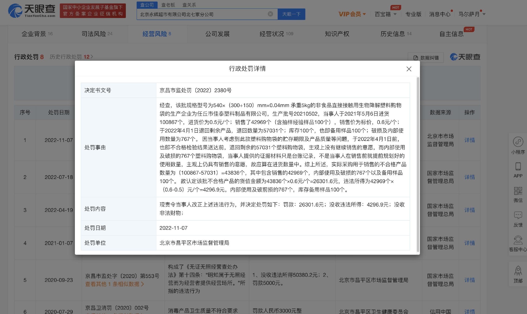 天眼查App顯示,近日,北京有限公司北七家分公司被北京市昌平區(qū)市場監(jiān)督管理局罰款2.6萬余元,并沒收違法所得4000余元。 處罰事由顯示,當(dāng)事人購進(jìn)10萬余個(gè)非食品直接接觸用生物降解購物袋,進(jìn)貨價(jià)為0.5元/個(gè),銷售價(jià)為標(biāo)價(jià)0.6元/個(gè),共銷售約4.3萬個(gè),后該購物袋經(jīng)檢驗(yàn),結(jié)果為不合格。 當(dāng)事人考慮到購物袋的貯存期限及產(chǎn)品質(zhì)量等問題,在不合格檢驗(yàn)結(jié)果送達(dá)前,已退回5.7萬余個(gè)。 |