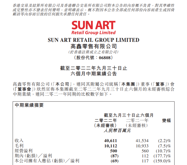 11月15日,高鑫零售(大潤(rùn)發(fā))發(fā)布截至9月30日的2023財(cái)年半年報(bào)。財(cái)報(bào)顯示,公司收入406.11億元,同比下滑2.2%;毛利為人民幣101.12億元,較截至上年同期的109.33億元減少8.21億元,減幅為7.5%。 截至2022年9月30日止六個(gè)月,高鑫零售(大潤(rùn)發(fā))期內(nèi)虧損為人民幣0.87億元,較截至2021年9月30日止同期的溢利人民幣1.12億元減少人民幣1.99億元,減幅為177.7%;公司擁有人應(yīng)占虧損為人民幣0.69億元,同比減幅為159.0%。 截至2023財(cái)年上半年,高鑫零售(大潤(rùn)發(fā))在29個(gè)省市自治區(qū)的239個(gè)城市共有488家大賣(mài)場(chǎng)、10家中型超市和99家小型超市。 |