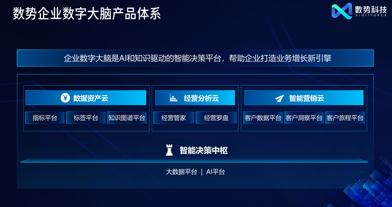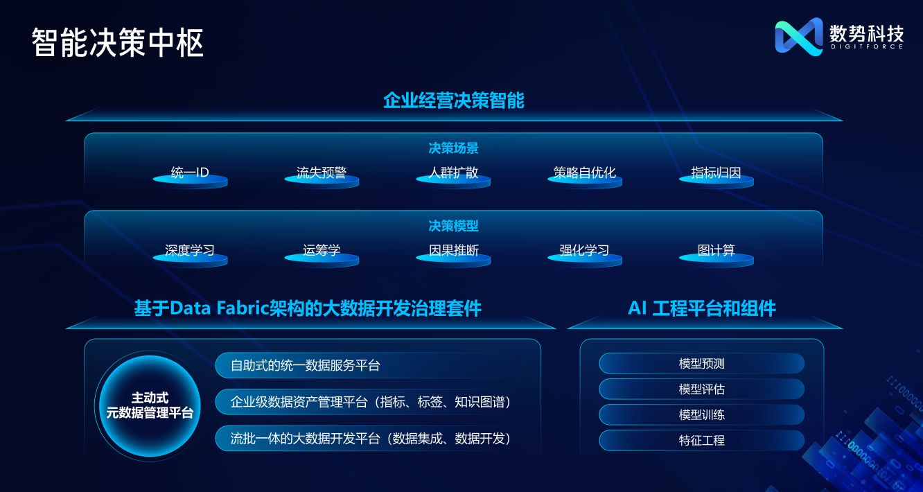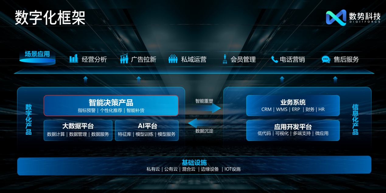 11 月 17 日下午,2022數(shù)勢(shì)科技產(chǎn)品發(fā)布會(huì)線上直播圓滿閉幕。發(fā)布會(huì)以“Digitforce 數(shù)字原力 勢(shì)在必行”為主題,面向企業(yè)核心經(jīng)營(yíng)場(chǎng)景,發(fā)布一系列基于企業(yè)數(shù)字大腦理念的智能決策產(chǎn)品,幫助企業(yè)最大化地發(fā)揮數(shù)據(jù)價(jià)值。會(huì)議當(dāng)中,數(shù)勢(shì)科技還邀請(qǐng)了眾多零售、金融企業(yè)的高管、數(shù)字化負(fù)責(zé)人和行業(yè)專家,分享數(shù)字化轉(zhuǎn)型的最佳實(shí)踐,共同探索企業(yè)數(shù)字化升級(jí)的最佳路徑。 (發(fā)布會(huì)活動(dòng)主舞臺(tái)) 數(shù)字化轉(zhuǎn)型 = 業(yè)務(wù)規(guī)劃+技術(shù)支持+組織變革 數(shù)字經(jīng)濟(jì)浪潮下,數(shù)字化轉(zhuǎn)型成為企業(yè)增長(zhǎng)的必經(jīng)之路,但何為可以創(chuàng)造價(jià)值的業(yè)務(wù)轉(zhuǎn)型?怎樣才能更好的實(shí)現(xiàn)企業(yè)韌性增長(zhǎng)?貝恩公司大中華區(qū)總裁、全球董事會(huì)成員韓微文先生在開(kāi)場(chǎng)演講中提出“數(shù)字化轉(zhuǎn)型 =業(yè)務(wù)規(guī)劃+技術(shù)支持+組織變革”。數(shù)字化轉(zhuǎn)型,要以能為消費(fèi)者和客戶帶來(lái)價(jià)值為根本出發(fā)點(diǎn),企業(yè)既要有過(guò)硬的技術(shù)能力,也要對(duì)行業(yè)趨勢(shì)有精準(zhǔn)洞察,以此形成基于行業(yè)Know-how和技術(shù)Know-how的扎實(shí)方法論,再配合企業(yè)內(nèi)部組織工作方式的提升,才能行之有效。 (貝恩大中華區(qū)總裁、全球董事會(huì)成員 韓微文) 數(shù)勢(shì)科技作為國(guó)內(nèi)領(lǐng)先的數(shù)據(jù)智能平臺(tái)與技術(shù)服務(wù)提供商,與韓總的見(jiàn)解不謀而合。數(shù)勢(shì)正是依托于核心團(tuán)隊(duì)豐富的金融和消費(fèi)領(lǐng)域業(yè)務(wù)know-how及技術(shù)know-how,研發(fā)智能決策產(chǎn)品,希望能助力更多企業(yè)實(shí)現(xiàn)數(shù)字化升級(jí),正是懷著這樣的初心,數(shù)勢(shì)科技于2020年正式成立。同時(shí),全球受疫情影響,越來(lái)越多的企業(yè)主動(dòng)擁抱數(shù)字化,對(duì)數(shù)字科技公司而言是挑戰(zhàn)也是機(jī)遇。數(shù)勢(shì)科技創(chuàng)始人兼CEO黎科峰博士率領(lǐng)團(tuán)隊(duì),將過(guò)去多年積累下來(lái)的數(shù)字化轉(zhuǎn)型經(jīng)驗(yàn)和最佳實(shí)踐,與傳統(tǒng)的實(shí)體經(jīng)濟(jì)相結(jié)合,打造出新時(shí)代的企業(yè)服務(wù)產(chǎn)品,希望幫助企業(yè)在數(shù)字化轉(zhuǎn)型的浪潮下,增強(qiáng)競(jìng)爭(zhēng)力,實(shí)現(xiàn)更長(zhǎng)遠(yuǎn)的健康發(fā)展。 智能決策:數(shù)字化時(shí)代企業(yè)提升經(jīng)營(yíng)效率的核心主題 黎科峰博士在演講中指出,“技術(shù)是真正能長(zhǎng)周期地去影響一個(gè)企業(yè),影響一個(gè)行業(yè)、甚至一個(gè)社會(huì)和國(guó)家的核心關(guān)鍵因素!庇(jì)算技術(shù)發(fā)展經(jīng)歷了從最初的電子化時(shí)代、PC時(shí)代,到如今云計(jì)算和大數(shù)據(jù)時(shí)代,我們正在邁向基于數(shù)據(jù)的智能時(shí)代。而與之對(duì)應(yīng)的企業(yè)經(jīng)營(yíng),也經(jīng)歷了從Excel時(shí)代到信息化時(shí)代,再到數(shù)字化時(shí)代的轉(zhuǎn)變。企業(yè)也面臨著諸多從信息化到數(shù)字化轉(zhuǎn)變中的差異性問(wèn)題,如從單一渠道經(jīng)營(yíng)向全渠道經(jīng)營(yíng)的轉(zhuǎn)變,以產(chǎn)品為中心向以用戶為中心的轉(zhuǎn)變。同時(shí)企業(yè)經(jīng)營(yíng)也從依賴于管理者和專家的經(jīng)驗(yàn)和直覺(jué),轉(zhuǎn)變?yōu)榛诖髷?shù)據(jù)和智能化的經(jīng)營(yíng)決策。 (數(shù)勢(shì)科技創(chuàng)始人兼CEO 黎科峰) 面對(duì)這些差異性問(wèn)題,企業(yè)需要從多個(gè)維度出發(fā),包括組織、文化、人才等等。但從技術(shù)的視角來(lái)看,企業(yè)也需要圍繞數(shù)字化構(gòu)建新的技術(shù)架構(gòu)。這個(gè)數(shù)字化架構(gòu)包括底層的基礎(chǔ)設(shè)施,像私有云、公有云、混合云、IoT設(shè)備等等,它是企業(yè)所有系統(tǒng)運(yùn)行的基座。在基礎(chǔ)設(shè)施之上分為數(shù)字化和信息化兩個(gè)部分,數(shù)字化會(huì)利用信息化產(chǎn)生的海量數(shù)據(jù),對(duì)數(shù)據(jù)進(jìn)行加工處理,并灌注智能化的能力,再通過(guò)智能決策產(chǎn)品,把決策作用到業(yè)務(wù)系統(tǒng)中,并進(jìn)行智能重塑。所以數(shù)字化部分和信息化部分是相輔相成的,它們形成了一個(gè)正向的循環(huán),從而產(chǎn)生合力,作用到企業(yè)的各類業(yè)務(wù)場(chǎng)景中。 黎博士認(rèn)為當(dāng)下企業(yè)的經(jīng)營(yíng)環(huán)境和之前的環(huán)境已大不相同,是一個(gè)更多維度更復(fù)雜的方程式,光靠過(guò)往的經(jīng)驗(yàn)和單純靠人腦已經(jīng)很難去解這樣一個(gè)高階的方程,F(xiàn)在企業(yè)經(jīng)營(yíng)中的決策需要更多地依賴大數(shù)據(jù),實(shí)現(xiàn)智能決策,即通過(guò)邏輯推理、因果分析和博弈論等知識(shí)框架,利用數(shù)據(jù)和模型在業(yè)務(wù)場(chǎng)景下進(jìn)行策略構(gòu)建和提供決策支持。這種智能的決策可以應(yīng)用在企業(yè)經(jīng)營(yíng)的方方面面,無(wú)論