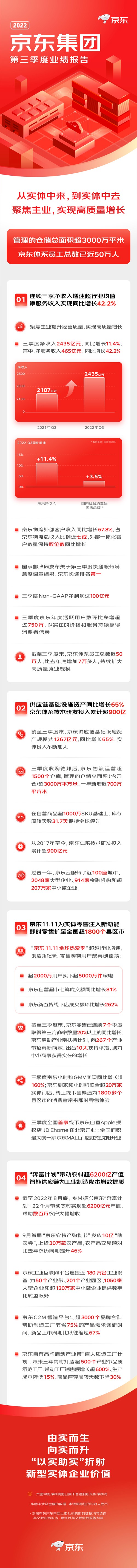 11月18日訊,京東發(fā)布2022年第三季度財報。財報顯示,京東集團第三季度營收2435.4億元,較2021年第三季度增加 11.4%。2022年第三季度服務(wù)收入為人民幣465億元(65億美元),較2021年第三季度增加42.2%。 2022年第三季度經(jīng)營利潤為人民幣87億元(12億美元),去年同期為人民幣26億元。 2022年第三季度非公認會計準則下2經(jīng)營利潤為人民幣99億元(14億美元),2021年第 三季度為人民幣46億元。2022年第三季度京東零售不含未分配項目的經(jīng)營利潤率為 5.2%,2021年第三季度為4.0%。 2022年第三季度歸屬于普通股股東的凈利潤為人民幣60億元(8億美元),去年同期為 凈損失人民幣28億元。2022年第三季度非公認會計準則下歸屬于普通股股東的凈利 潤為人民幣100億元(14億美元),去年同期為人民幣50億元。 財報顯示,京東集團第三季度年度活躍用戶帳戶5.88億,預(yù)估5.9億。 截至2022年9月30日,京東體系員工總數(shù)近50萬人,比去年底增加7萬多人。 此外,截至2022年9月30日,京東集團供應(yīng)鏈基礎(chǔ)設(shè)施資產(chǎn)規(guī)模達到1267億元,同比增幅達到65%;其中,京東物流運營超過1500個倉庫,包含云倉生態(tài)平臺上的云倉管理面積在內(nèi),倉儲總管理面積超過3000萬平方米。從2017年提出面向技術(shù)轉(zhuǎn)型以來,截至2022年三季度末,京東體系在基礎(chǔ)科學(xué)和技術(shù)研發(fā)上的累計投入已超過900億元。 |