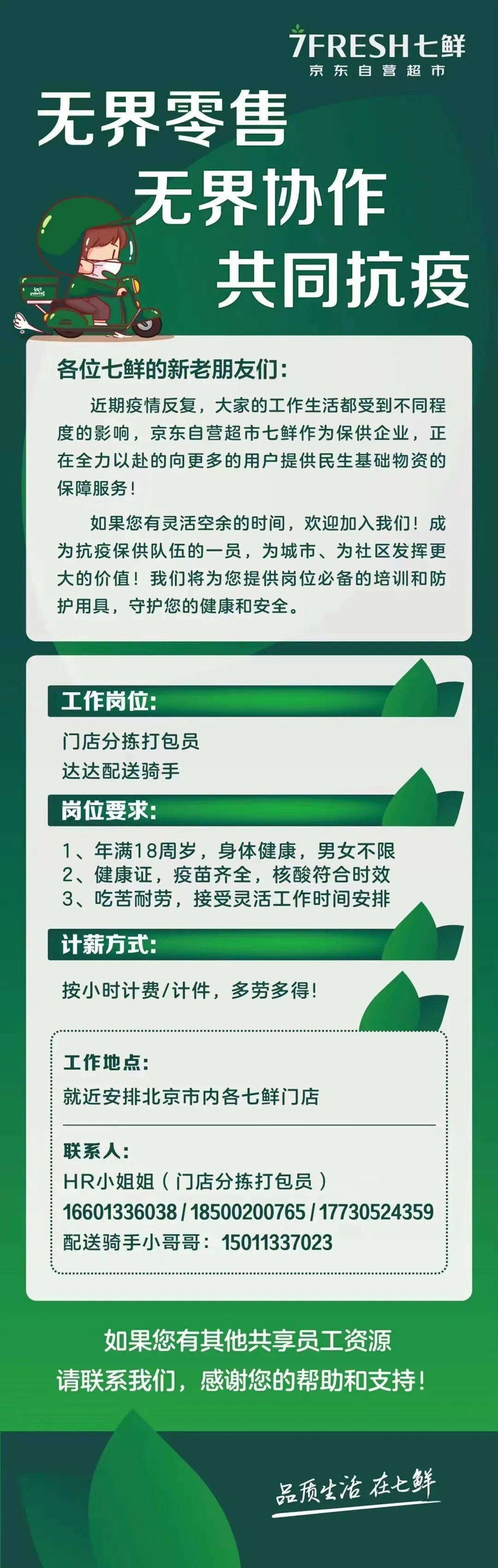 11月30日,京東旗下七鮮超市重啟共享用工。近期疫情反復(fù),大家的工作生活都受到不同程度的影響,京東自營超市七鮮超市作為保供企業(yè),正在全力以赴的向更多的用戶提供民生基礎(chǔ)物資的保障服務(wù)! 如果你能有靈活空余的時間,歡迎加入我們!成為抗議保供隊伍的一員,為城市、為社區(qū)發(fā)揮更大的價值!我們將為您提供崗位必備的培訓(xùn)和防護(hù)用具,守護(hù)您的健康和安全。 |