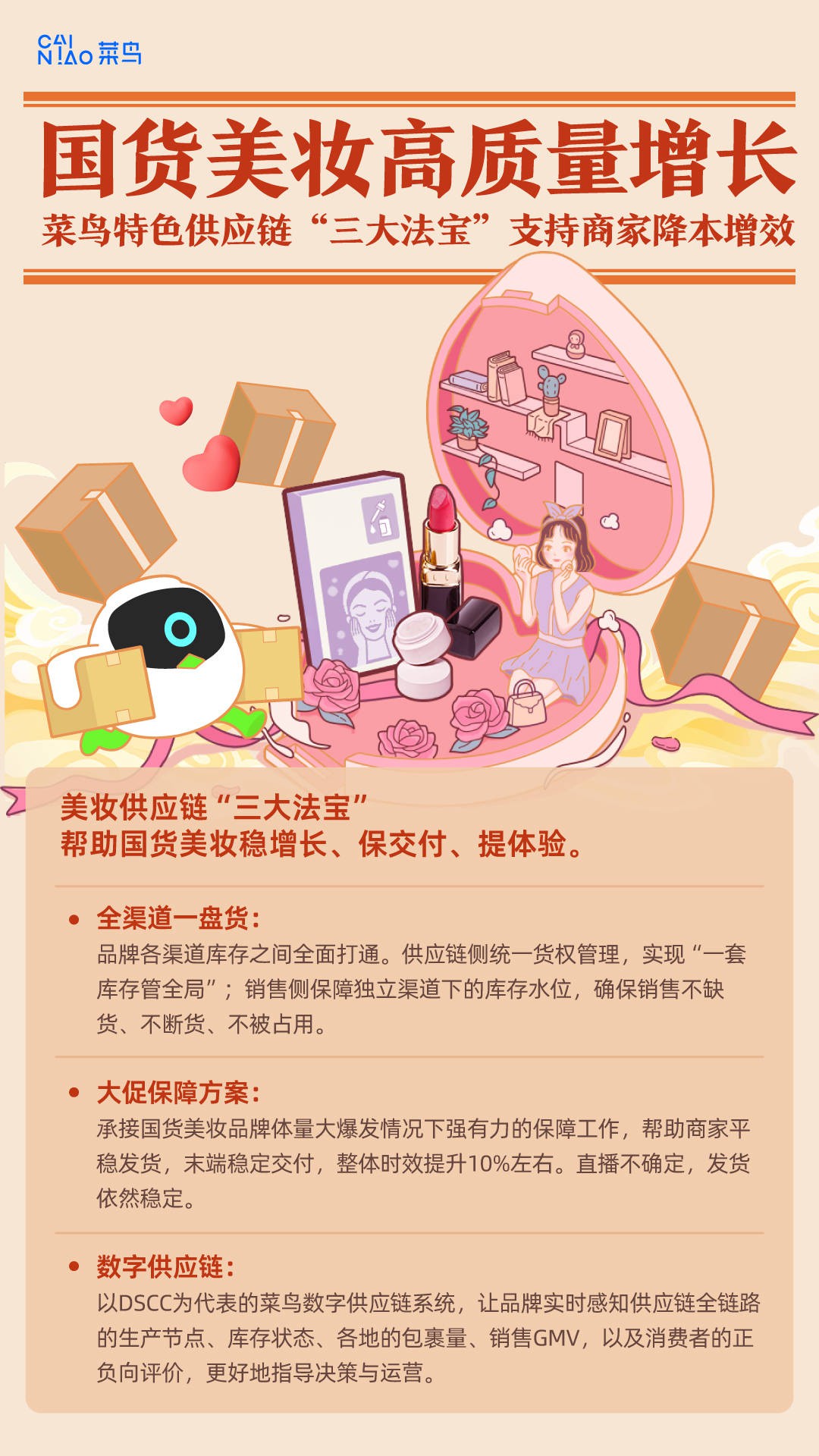 消費大環(huán)境的逐漸復(fù)蘇,正在帶動美妝消費需求的不斷回暖。這其中,國貨美妝無疑是該領(lǐng)域最火熱的“賽道”。據(jù)天貓官方透露,過去3年,有超過6000個美妝品牌在天貓開設(shè)旗艦店,其中國貨品牌占比達到8成。在95后年輕人的化妝臺上,已有超過4成是國貨,而00后國貨消費增速最快。 菜鳥在消費者調(diào)研中發(fā)現(xiàn),消費復(fù)蘇時代,年輕消費者對國貨美妝的消費體驗,尤其是物流體驗提出了更高的要求。不僅要求送得快,還要送得好。 日前,記者獲悉,菜鳥面向國貨美妝品牌商家推出了特色供應(yīng)鏈“三大法寶”,幫助國貨美妝穩(wěn)增長、保交付、提體驗。 菜鳥推出的特色供應(yīng)鏈“三大法寶”包括全渠道一盤貨、大促保障方案和數(shù)字供應(yīng)鏈。 首先,隨著銷售渠道越來越多樣化,每一個渠道都要對應(yīng)一套獨立的庫存以滿足銷售,對供應(yīng)鏈計劃和備貨準確性越來越有挑戰(zhàn),如何優(yōu)化不同渠道之間的庫存,已經(jīng)成為許多品牌不得不思考的一個問題。 菜鳥通過全渠道一盤貨產(chǎn)品,實現(xiàn)品牌各渠道庫存之間的全面打通。供應(yīng)鏈側(cè)實現(xiàn)統(tǒng)一的貨權(quán)管理,優(yōu)化庫存割裂的狀態(tài),實現(xiàn)“一套庫存管全局”;銷售側(cè)則保障獨立渠道下的庫存水位,確保銷售不缺貨、不斷貨、不被占用。商家管理庫存的精細度得到加強,在備貨量及周轉(zhuǎn)上都能實現(xiàn)極大的降本增效。 其次,美妝行業(yè)有一大特性,大促銷量往往呈現(xiàn)幾十倍的爆發(fā)。如何保障平穩(wěn)發(fā)貨、末端穩(wěn)定交付?菜鳥美妝供應(yīng)鏈有針對性地推出了大促保障方案。今年雙11期間,華熙生物在李佳琦直播間的加持下,訂單量大漲,供應(yīng)鏈壓力陡增。菜鳥美妝供應(yīng)鏈通過大促保障策略,啟動三倉發(fā)全國,不僅幫助商家實現(xiàn)快速發(fā)貨,整體時效還提升了10%左右。 菜鳥美護供應(yīng)鏈負責人孫婷表示,今年大促菜鳥承接了許多國貨美妝商家體量大爆發(fā)時強有力的保障工作,比如夸迪、米蓓爾、相宜本草等,“我們能很好地幫品牌商家保證供應(yīng)鏈的穩(wěn)定高效,直播不確定,發(fā)貨依然穩(wěn)定,實現(xiàn)完美履約! 同時,以DSCC為代表的菜鳥數(shù)字供應(yīng)鏈系統(tǒng),也能讓品牌商家實時看到供應(yīng)鏈全鏈路的生產(chǎn)節(jié)點、庫存狀態(tài)、各地的包裹量、銷售GMV,以及消費者的正負向評價,讓商家對整個物流的生產(chǎn)作業(yè)有感知,更好地指導(dǎo)品牌商家的決策與運營。 中國市場擁有培育新興品牌最好的土壤,這里有頂級的原材料、最新的生產(chǎn)技術(shù)與設(shè)備,國際大牌的包裝與容器廠商也在中國,由此也孕育了一大批優(yōu)質(zhì)的國貨美妝品牌。這些品牌與老牌的國際美妝大牌相比,產(chǎn)品力已經(jīng)不落下風(fēng),但是在供應(yīng)鏈效率、管理效率等方面,依然存在差距!安锁B希望用自己的倉配能力、供應(yīng)鏈能力,助力國貨品牌更好地實現(xiàn)增長!睂O婷說。 |