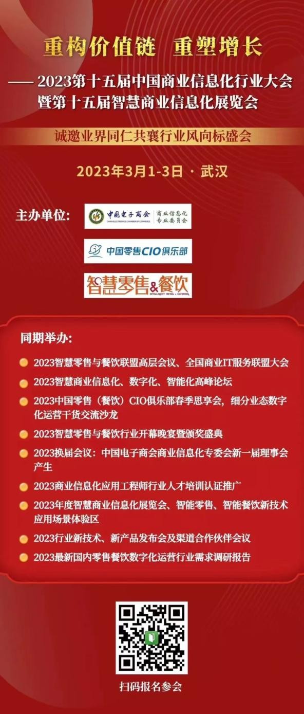 2022年作為后疫情時(shí)代的收官之戰(zhàn),零售行業(yè)的格局正在以前所末有的速度被顛覆、被重塑,新的技術(shù)、業(yè)態(tài)和商業(yè)模式層出疊現(xiàn)。零售數(shù)字化的價(jià)值創(chuàng)造更多回歸了零售的本質(zhì),以數(shù)字化能力為核心,以互聯(lián)網(wǎng)平臺(tái)、流量運(yùn)營(yíng)、新技術(shù)為支撐,形成品牌力、產(chǎn)品力、渠道力、零售力、組織力、文化力相輔相成的生態(tài)鏈,促進(jìn)產(chǎn)業(yè)和企業(yè)策略的升級(jí)發(fā)展;持續(xù)通過(guò)數(shù)字化技術(shù)對(duì)傳統(tǒng)管理模式、業(yè)務(wù)模式、商業(yè)模式進(jìn)行創(chuàng)新和重塑,從而提升企業(yè)核心競(jìng)爭(zhēng)力;找到數(shù)字化突破口以快速證明數(shù)字化價(jià)值。 通過(guò)數(shù)字化生態(tài)合作與協(xié)同,打通線上線下融合、場(chǎng)景與技術(shù)融合、智能設(shè)備與軟件融合、新老系統(tǒng)對(duì)接、SaaS與ERP對(duì)接、全渠道中臺(tái)對(duì)接、業(yè)務(wù)與運(yùn)營(yíng)融合、企業(yè)內(nèi)外部資源融合,以用戶(hù)需求為中心,以數(shù)字化能力為核心實(shí)現(xiàn)價(jià)值鏈重構(gòu),增長(zhǎng)模式的重塑! 2023 年由中國(guó)電子商會(huì)商業(yè)信息化專(zhuān)委會(huì)、中國(guó)零售CIO俱樂(lè)部、《智慧零售與餐飲》主辦的以“重構(gòu)價(jià)值鏈、重塑增長(zhǎng)” 為主題的行業(yè)風(fēng)向標(biāo)會(huì)議——第十五屆中國(guó)商業(yè)信息化行業(yè)大會(huì)暨智慧商業(yè)信息化展覽會(huì)3月1-3日在武漢召開(kāi)。行業(yè)大咖及新銳共同探討數(shù)字化轉(zhuǎn)型落地的痛點(diǎn)和切實(shí)需求,不斷深化和完善數(shù)字化運(yùn)營(yíng)模式,通過(guò)生態(tài)合作促進(jìn)提升數(shù)字化服務(wù)能力和落地價(jià)值.;行業(yè)同仁在聚智交流合作中洞見(jiàn)未來(lái)數(shù)字商業(yè)發(fā)展趨勢(shì),以及從信息化到數(shù)字化到智能化的演變和實(shí)踐真知。誠(chéng)摯邀請(qǐng)您參加合作一年一度的中國(guó)智慧商業(yè)信息化、數(shù)字化、智能化行業(yè)盛會(huì),碰撞智慧與落地方案,相互啟迪,相互賦能,攜手共進(jìn)! 2023第十五屆中國(guó)商業(yè)信息化行業(yè)大會(huì)暨智慧商業(yè)信息化展覽會(huì)亮點(diǎn) 大會(huì)宗旨:把脈行業(yè)走勢(shì),數(shù)字化實(shí)踐干貨借鑒,落地為真,價(jià)值為本 同期召開(kāi): 2023智慧零售與餐飲聯(lián)盟高層會(huì)議、全國(guó)IT服務(wù)聯(lián)盟大會(huì) 2023智慧商業(yè)信息化、數(shù)字化、智能化高峰論壇 2023中國(guó)零售(餐飲)俱樂(lè)部春季思享會(huì),細(xì)分業(yè)態(tài)數(shù)字化運(yùn)營(yíng)干貨交流沙龍 2023智慧零售與餐飲行業(yè)開(kāi)幕晚宴暨頒獎(jiǎng)盛典 2023換屆會(huì)議:中國(guó)電子商會(huì)商業(yè)信息化專(zhuān)委會(huì)新一屆理事會(huì)產(chǎn)生 2023商業(yè)信息化應(yīng)用工程師行業(yè)人才培訓(xùn)認(rèn)證推廣 2023年度智慧商業(yè)信息化展覽會(huì)、智能零售、智能餐飲新技術(shù)應(yīng)用場(chǎng)景體驗(yàn)區(qū) 2023行業(yè)新技術(shù)、新產(chǎn)品發(fā)布會(huì)及渠道合作伙伴會(huì)議 2023最新國(guó)內(nèi)零售餐飲數(shù)字化運(yùn)營(yíng)行業(yè)需求調(diào)研報(bào)告 PART 1 :3月1日——2023年智慧零售與餐飲聯(lián)盟高層會(huì)議、全國(guó)商業(yè)IT服務(wù)商聯(lián)盟大會(huì)重磅開(kāi)啟、中國(guó)零售(餐飲)CIO 俱樂(lè)部春季思享會(huì)、開(kāi)幕晚宴暨年度智慧零售與餐飲頒獎(jiǎng)盛典 在大會(huì)展覽開(kāi)幕的當(dāng)天下午3月1日召開(kāi)——2023年智慧零售與餐飲聯(lián)盟高層會(huì)議、全國(guó)商業(yè)IT服務(wù)商聯(lián)盟大會(huì),邀請(qǐng)來(lái)自全國(guó)的優(yōu)秀服務(wù)商企業(yè)高層、新零售專(zhuān)家、深入探討IT渠道商從產(chǎn)品經(jīng)銷(xiāo)到服務(wù)商、運(yùn)營(yíng)商的轉(zhuǎn)型升級(jí)、用戶(hù)方案成熟應(yīng)用和服務(wù)價(jià)值最大化。通過(guò)專(zhuān)家培訓(xùn)和業(yè)界交流,促進(jìn)各地培養(yǎng)一批具有用戶(hù)服務(wù)能力的服務(wù)商企業(yè),能夠本地化及時(shí)支持用戶(hù)的需求,為用戶(hù)提供整體解決方案和更有價(jià)值的服務(wù)。 智慧零售與餐飲聯(lián)盟高層會(huì)議、全國(guó)商業(yè)IT服務(wù)商聯(lián)盟會(huì)現(xiàn)場(chǎng) 在大會(huì)展覽開(kāi)幕的當(dāng)天下午3月1日召開(kāi)——中國(guó)零售(餐飲)CIO俱樂(lè)部年度思享會(huì)(細(xì)分業(yè)態(tài)會(huì)議)匯集零售餐飲數(shù)字化同仁進(jìn)行數(shù)字化實(shí)戰(zhàn)經(jīng)驗(yàn)的交流研討會(huì),與會(huì)代表圍繞2023面臨的挑戰(zhàn)和對(duì)策;深度數(shù)字化運(yùn)營(yíng)提升效益、重塑增長(zhǎng)的基礎(chǔ)是什么,實(shí)踐重心和心得體會(huì);面臨的難點(diǎn)、下一步探索項(xiàng)目以及策略進(jìn)行深入的交流。細(xì)分業(yè)態(tài)包括多業(yè)態(tài)集團(tuán)、超市及便利店、百貨及購(gòu)物中心、食品及生鮮、專(zhuān)賣(mài)、餐飲及茶飲等。 中國(guó)零售CIO俱樂(lè)部年度思享會(huì)現(xiàn)場(chǎng) PART 2 :3月2日——2023智慧商業(yè)信息化、數(shù)字